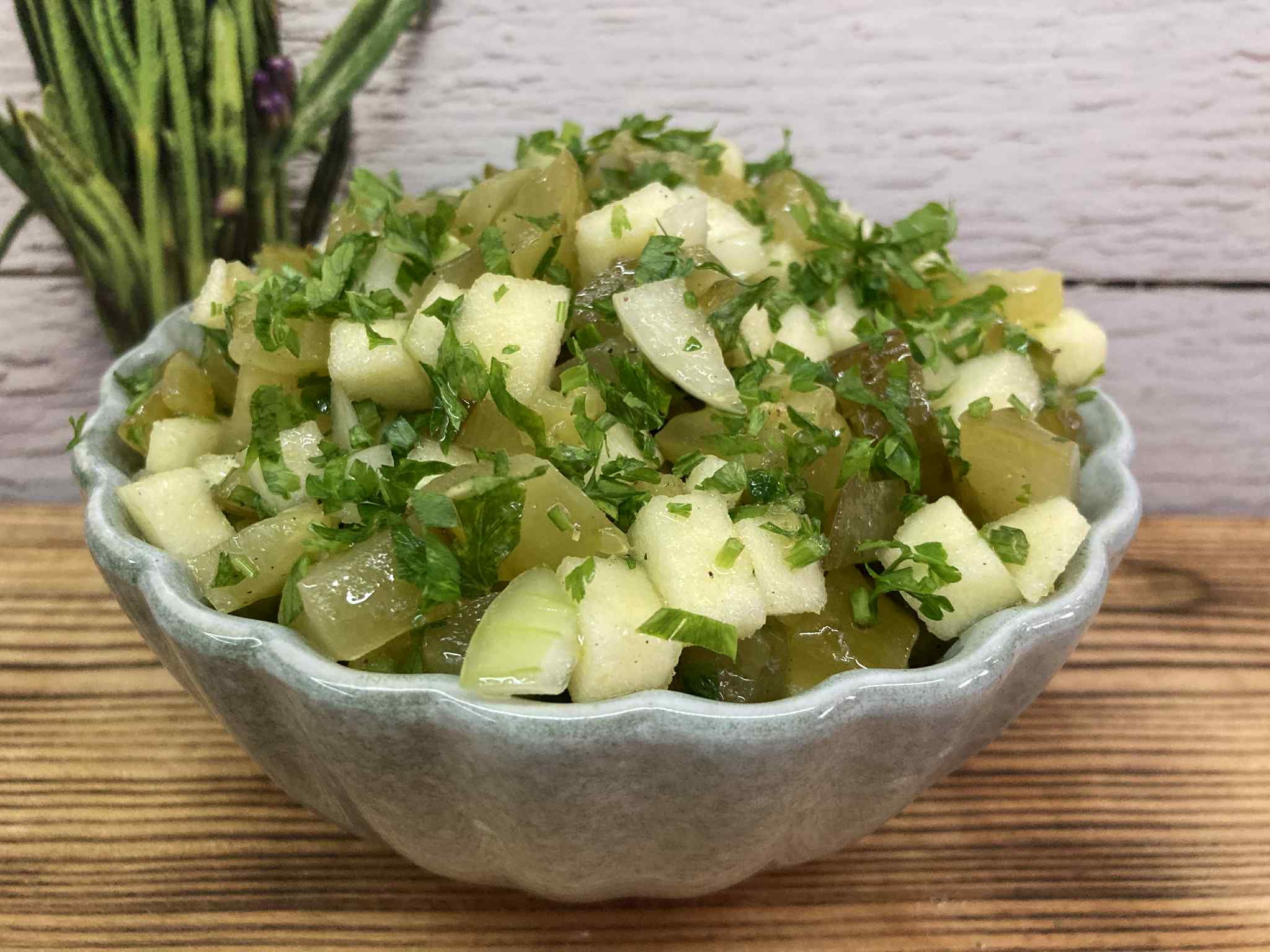Ta surówka to idealne połączenie chrupiącej kapusty pekińskiej, soczystego jabłka i delikatnie pikantnej czerwonej cebuli. Słodycz owocu świetnie przełamuje wyrazisty smak cebuli. Surówka nie tylko pięknie wygląda dzięki kolorowym składnikom, ale także świetnie komponuje się z daniami mięsnymi, rybami czy jako lekki dodatek do obiadu. Prosta, zdrowa i pełna smaku – idealna na co dzień i od święta.