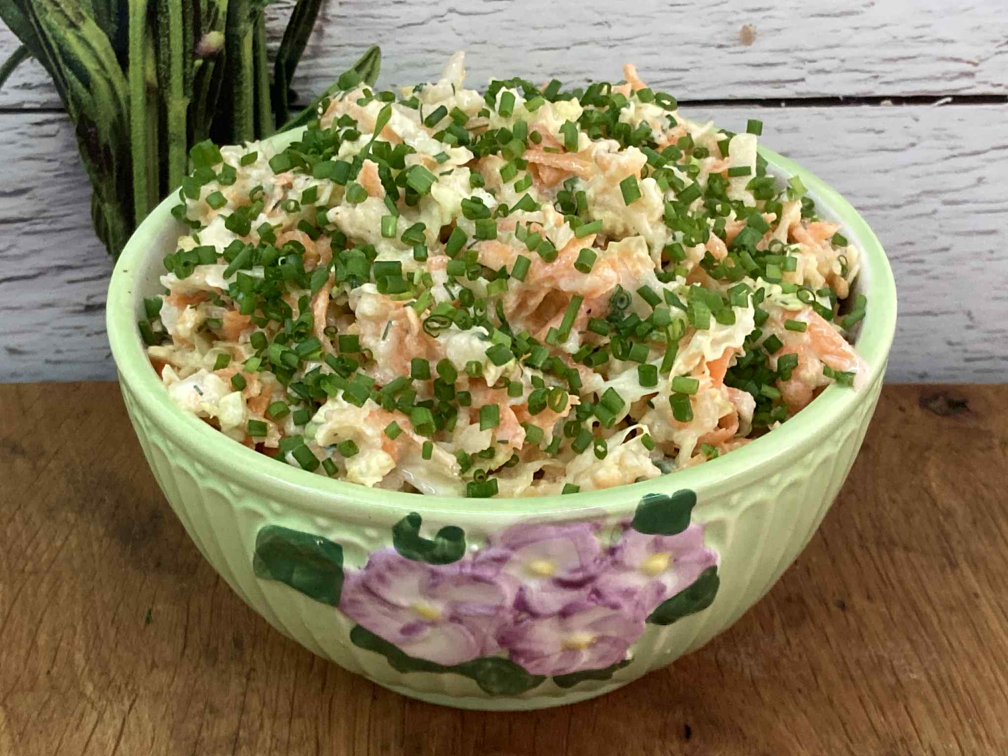 Kapustę pokrój w cienkie paski, cebulę pokrój w kostkę a jabłka zetrzyj na tarce o grubych oczkach, szczypiorek posiekaj i wszystko razem wymieszaj. W miseczce wymieszaj jogurt z majonezem, dodaj przeciśnięty przez praskę czosnek, wymieszać i połącz z warzywami. Na koniec dopraw do smaku solą i pieprzem i wstaw do lodówki na pół godziny.