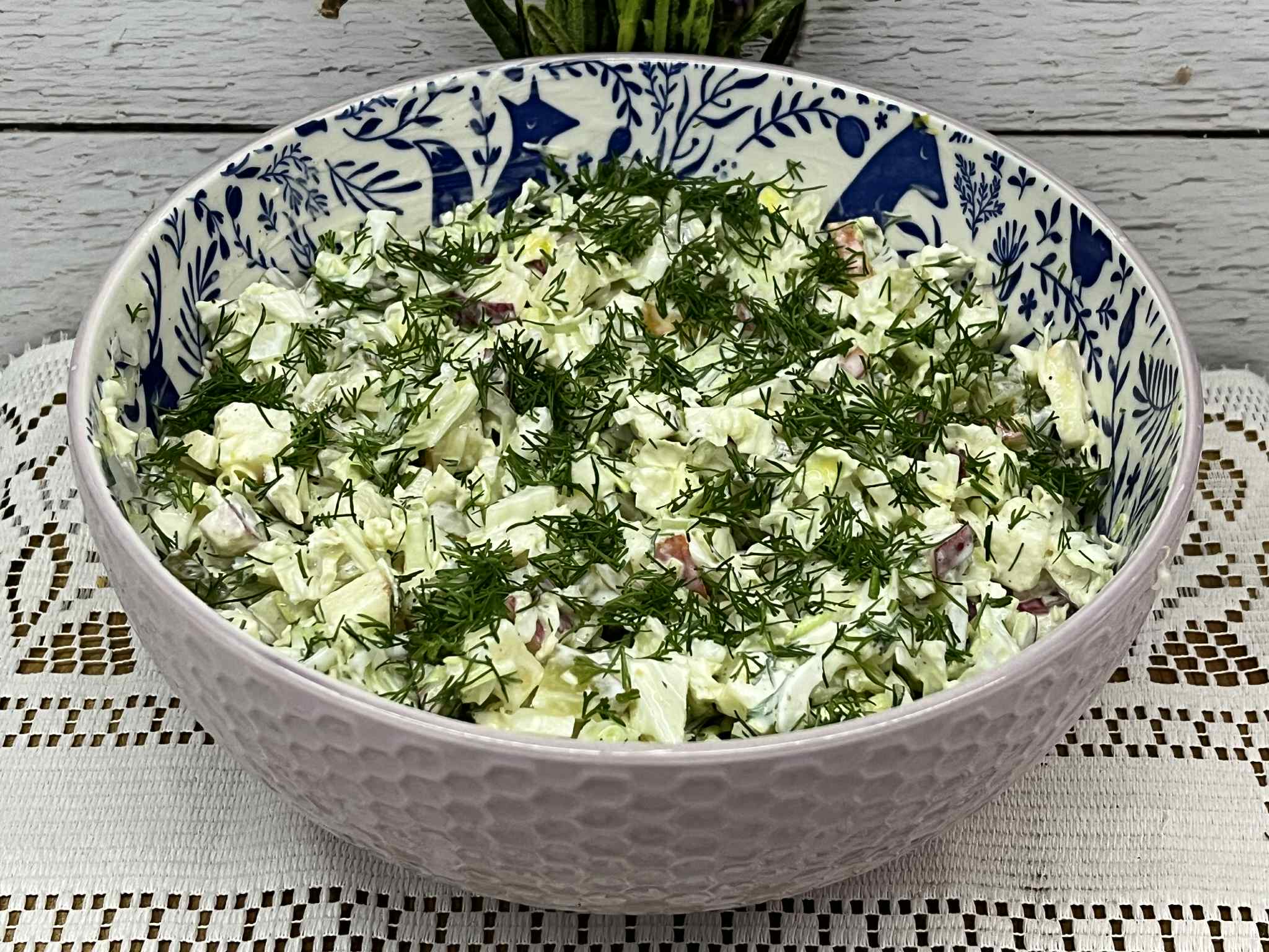 Lekka i chrupiąca surówka z kapusty pekińskiej, ogórka i czerwonej cebuli z dodatkiem koperku oraz szczypiorku to idealny dodatek do obiadu lub grilla. Sos koperkowo-ziołowy nadaje jej wyjątkowego aromatu i świeżego smaku. Przygotujesz ją w kilka minut, a zachwyci każdego swoją prostotą i wyrazistością.