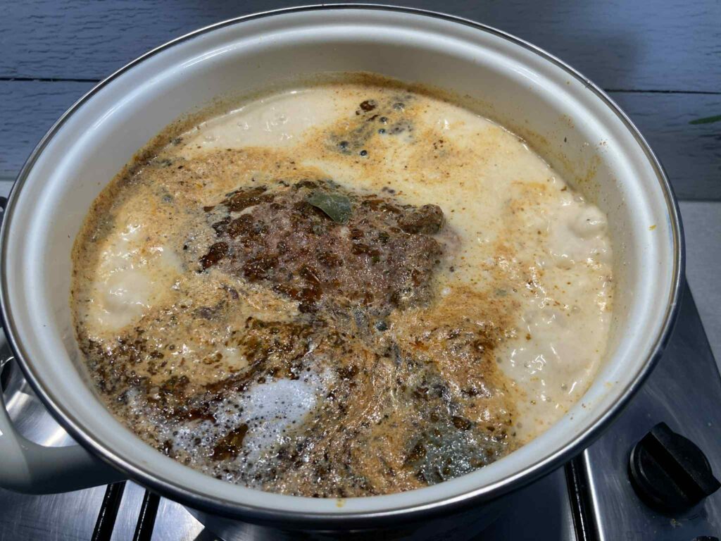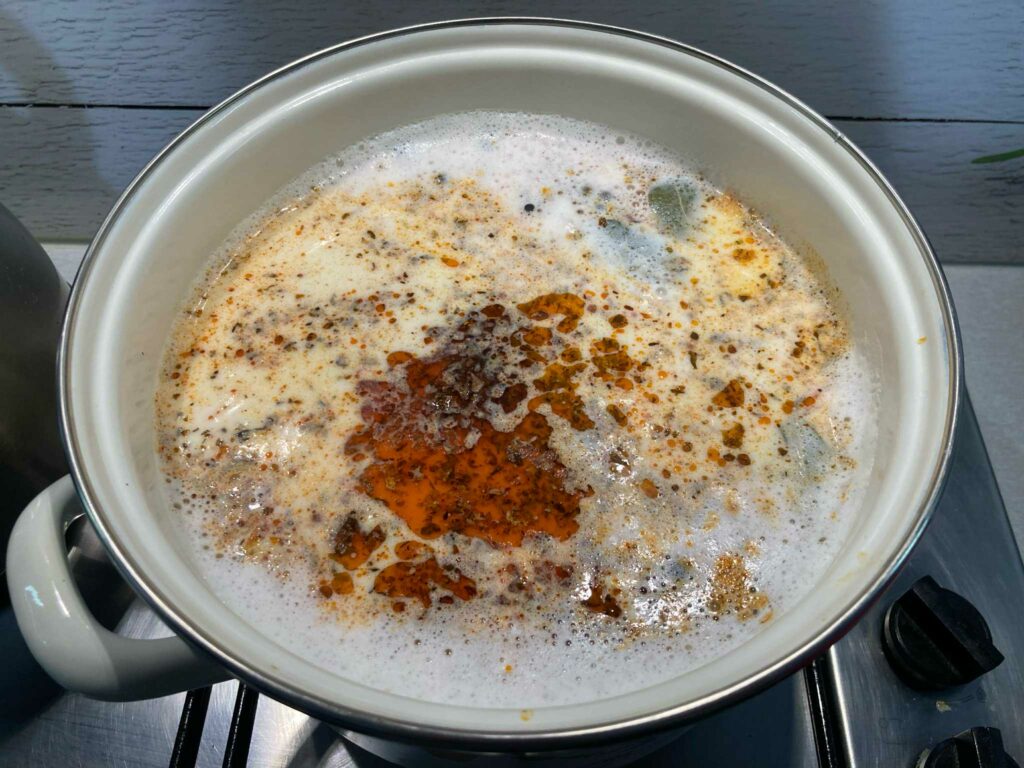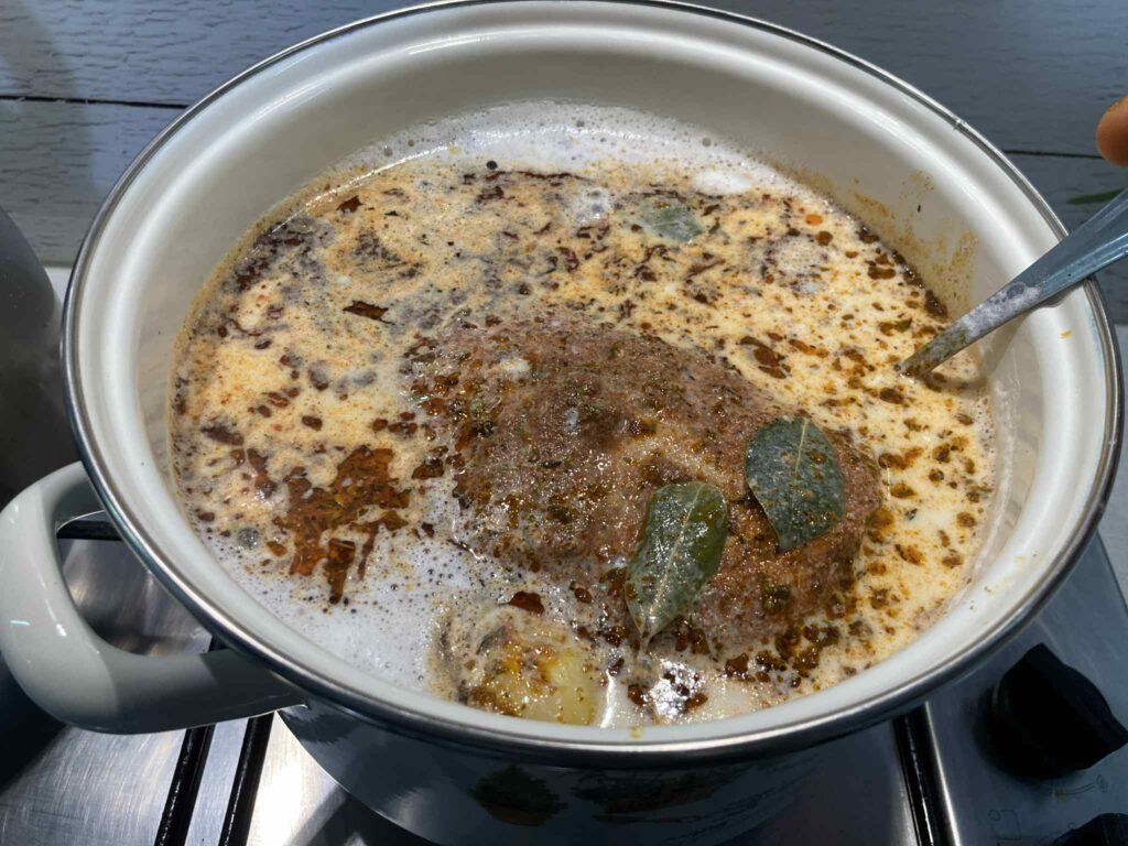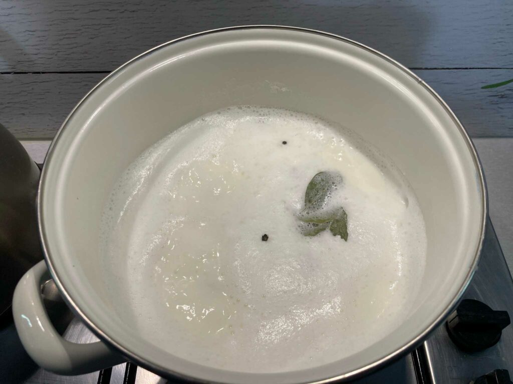 W dużym garnku zagotuj mleko z wodą, dodaj liście laurowe i ziele angielskie.
