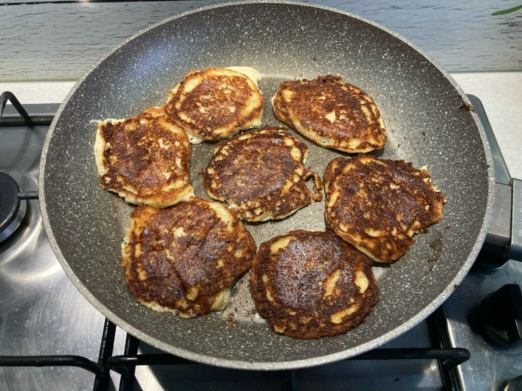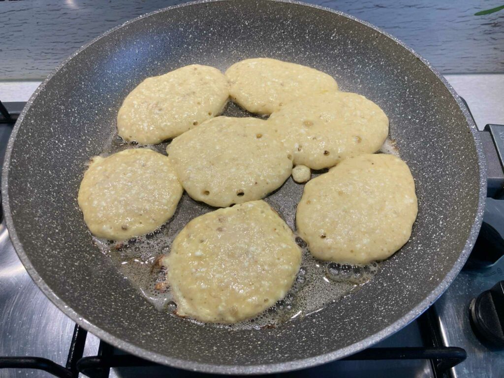 Na patelni rozgrzej odrobinę oleju lub masła klarowanego. Nakładaj porcje ciasta łyżką i smaż na małym ogniu z obu stron na złoty kolor (ok. 2–3 minuty z każdej)