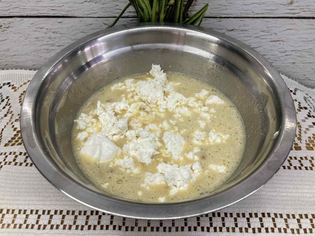 Twaróg możesz rozgnieść widelcem lub zmielić — zależnie od tego, czy lubisz gładkie, czy lekko grudkowate placuszki.