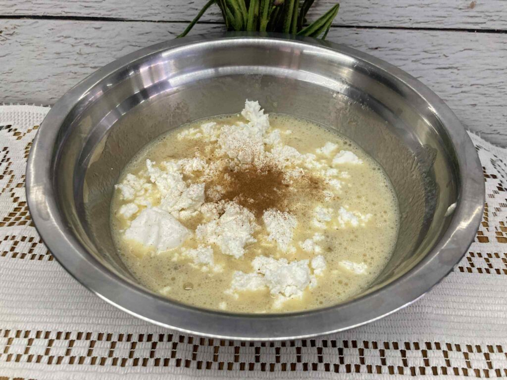 Wrzuć twaróg, cukier waniliowy i cynamon. Wszystko połącz, żeby powstała jednolita, gęsta masa.