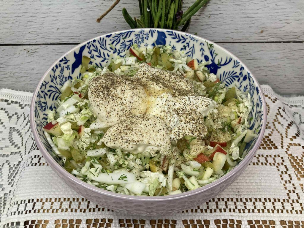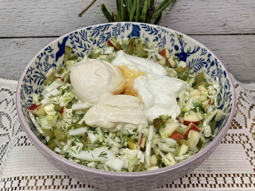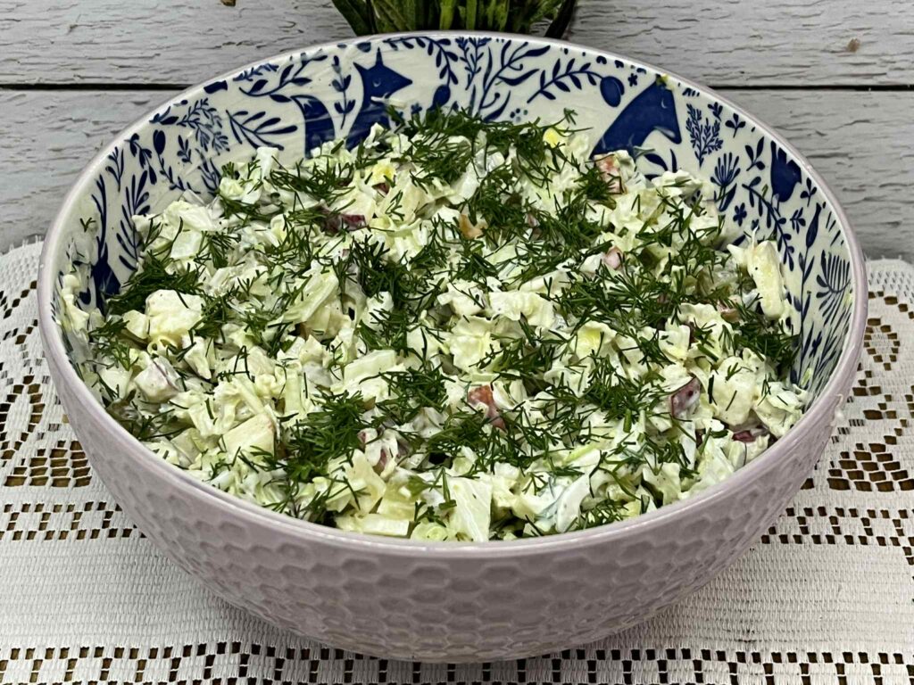 Ta surówka to świetny dodatek do obiadu – lekka, delikatnie słodko-kwaśna, z przyjemną nutą koperku i jogurtowo-miodowym sosem. Robi się ją błyskawicznie, a smakuje jak z najlepszej domowej kuchni.