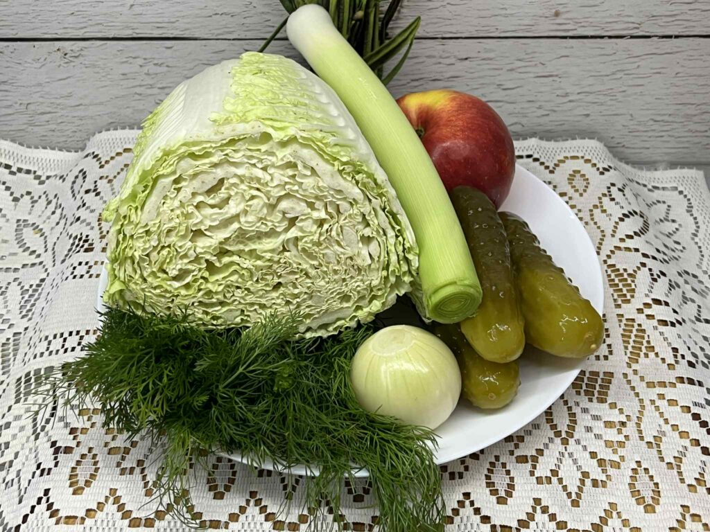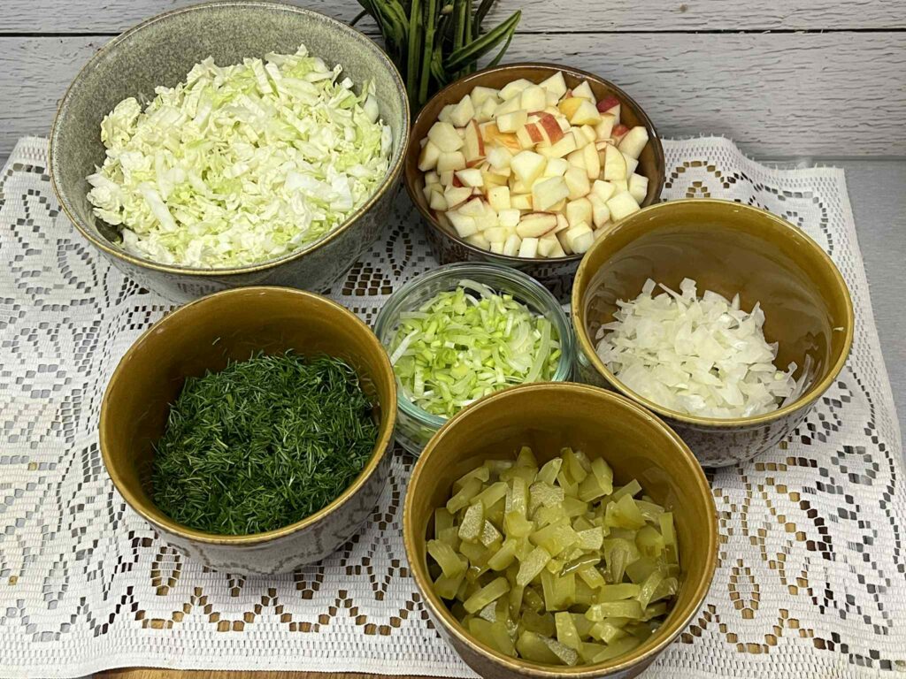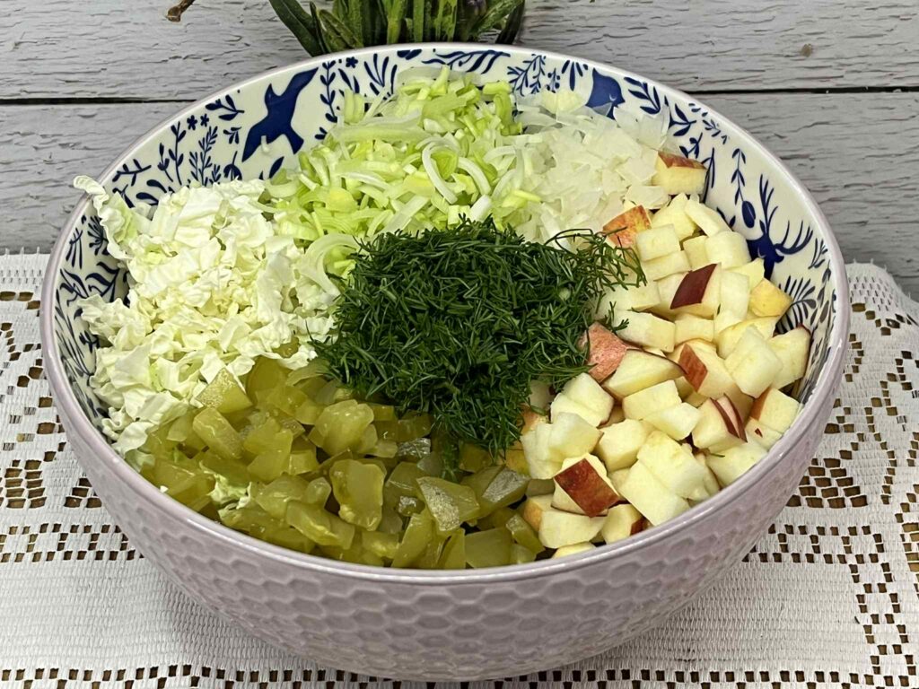 Kapustę pekińską posiekaj w cienkie paseczki. Przełóż do dużej miski. Pora przekrój wzdłuż i pokrój bardzo cienko. Cebulę posiekaj drobno. Ogórki kiszone zetrzyj na tarce lub pokrój w drobną kostkę. Jabłko zetrzyj na dużych oczkach lub pokrój w kostkę.