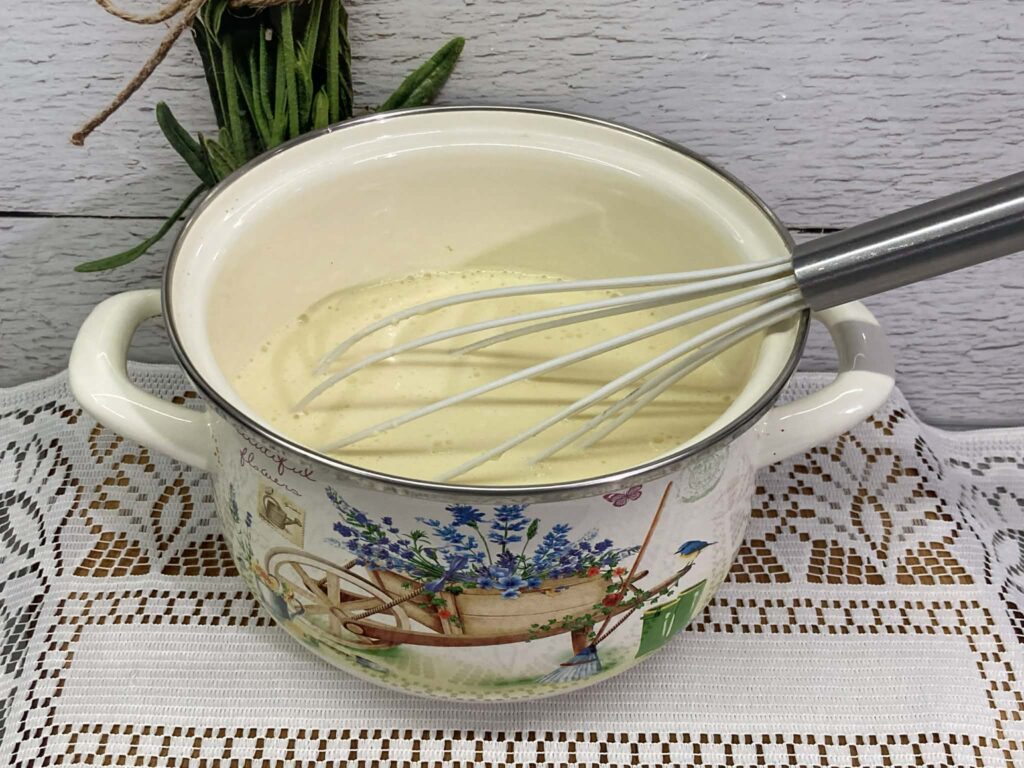 W misce roztrzep jajka – możesz użyć trzepaczki lub widelca. Dodaj mleko, wodę gazowaną, sól i (jeśli używasz) cukier waniliowy. Wymieszaj. Stopniowo wsypuj mąkę, cały czas mieszając, aż powstanie gładkie, jednolite ciasto bez grudek.