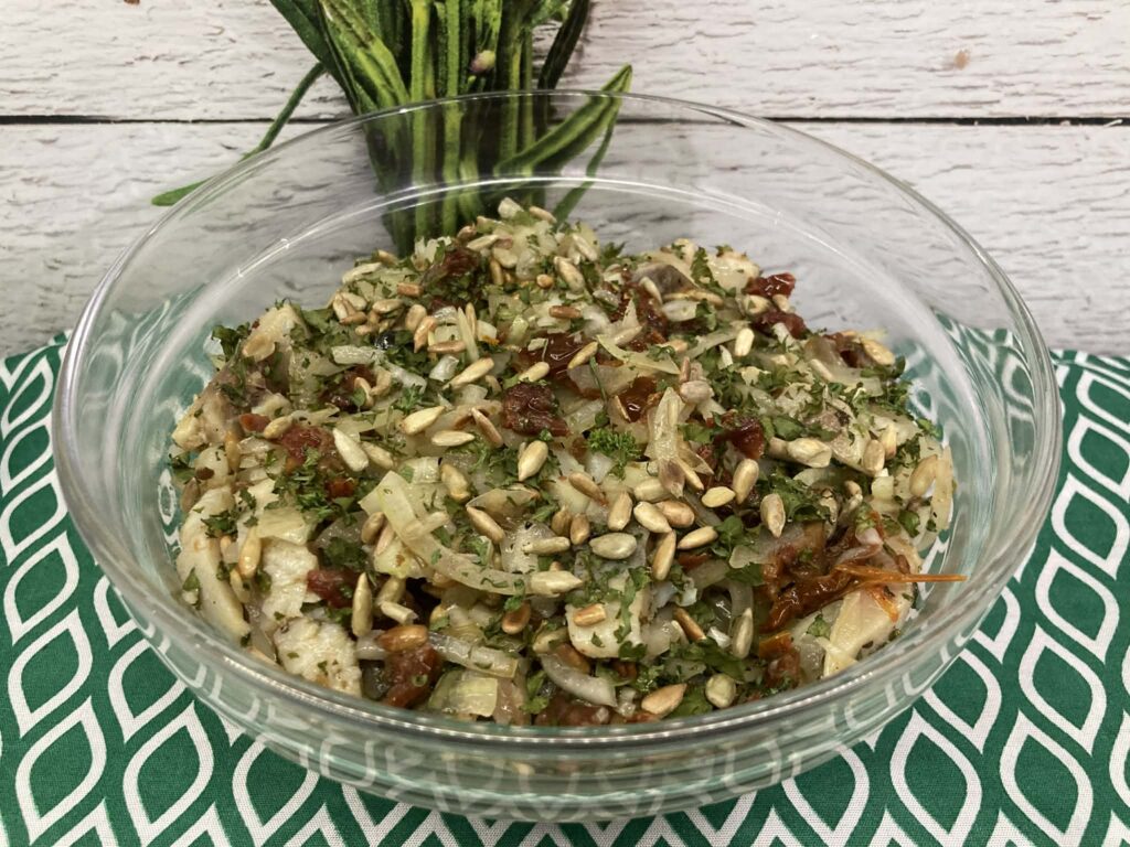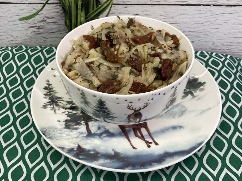 Sałatka najlepiej smakuje po godzinie w lodówce – smaki się przegryzą i aromaty pięknie się połączą.