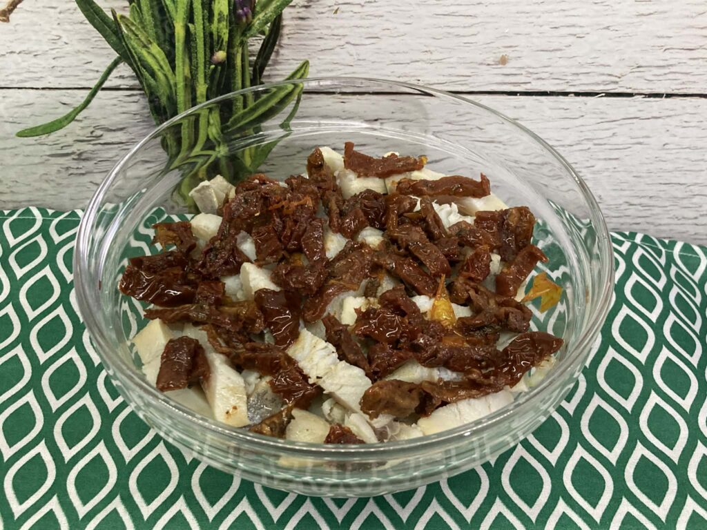Suszone pomidory pokrój je w paseczki. Najlepiej używać tych z oleju – są miękkie i mają intensywny aromat.