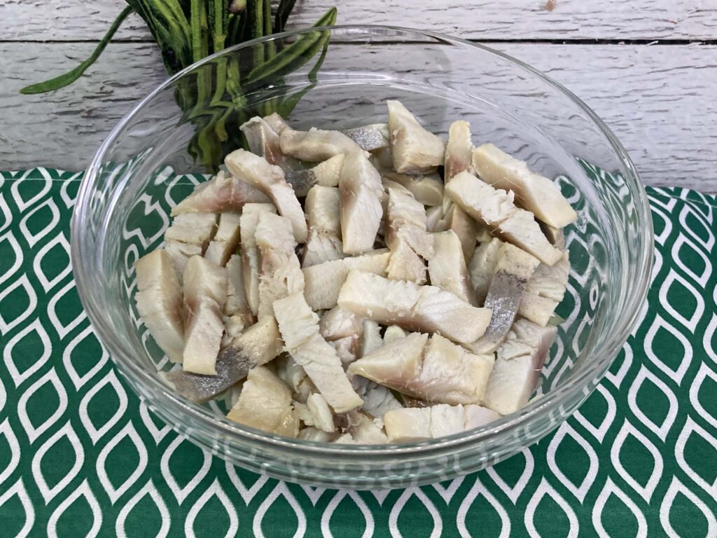 Płaty opłucz pod bieżącą wodą. Jeśli są bardzo słone, namocz je w zimnej wodzie przez 1–2 godziny, zmieniając wodę co jakiś czas. Osusz papierowym ręcznikiem.