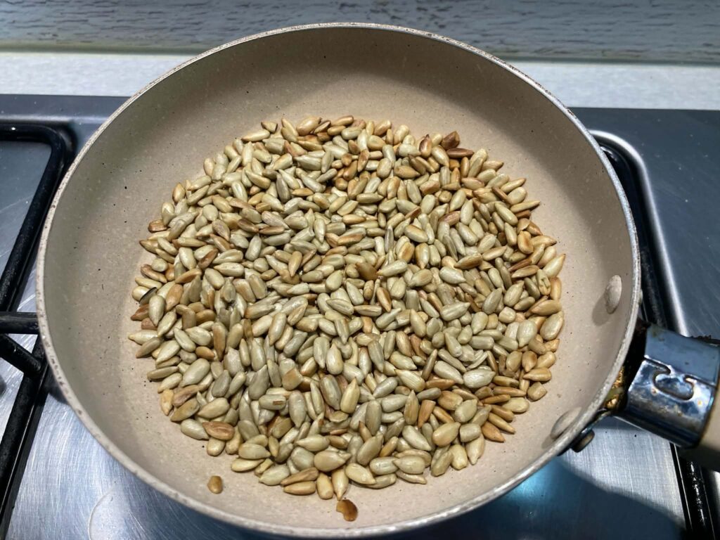 Na suchą patelnię wsyp nasiona słonecznika. Praż przez 2–3 minuty, aż lekko się zarumienią i zaczną pachnieć. Odstaw do wystudzenia.