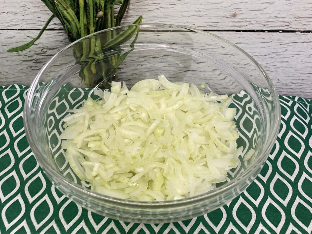 Obierz cebule i pokrój w drobną kostkę lub paski. Jeśli chcesz złagodzić smak, zalej cebulę wrzątkiem na 15 sekund, a potem odcedź i wystudź.