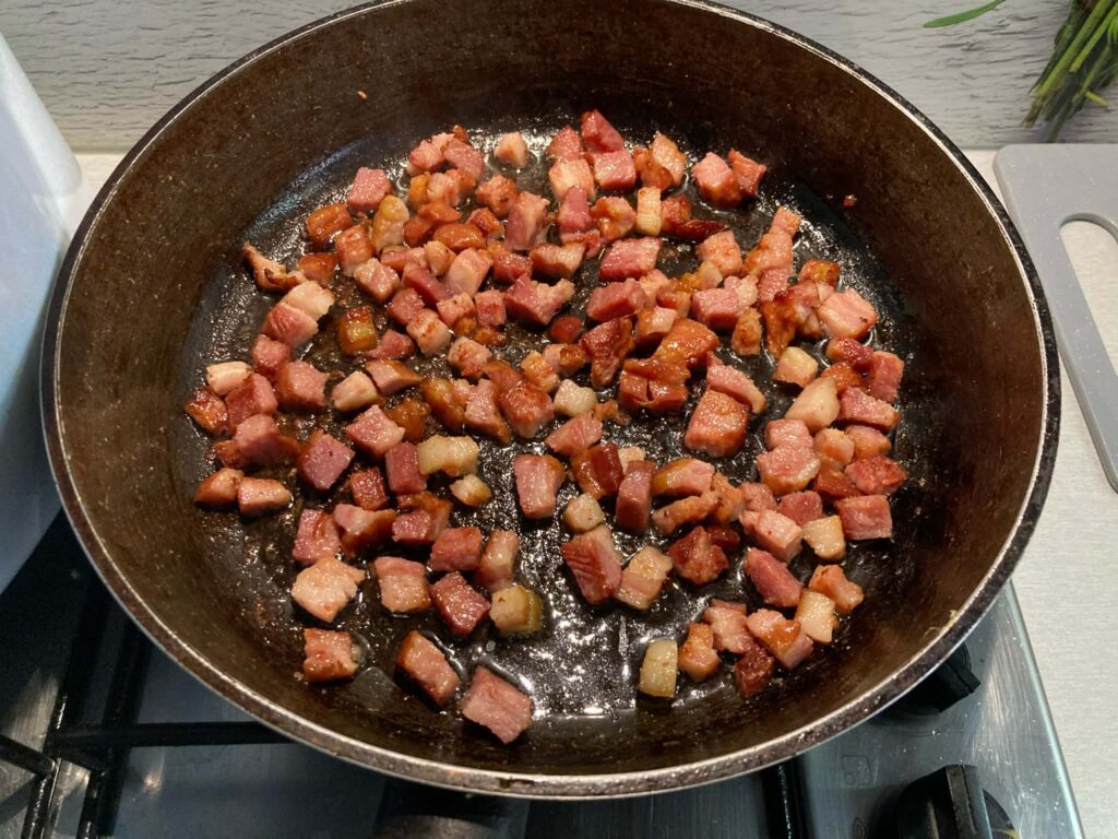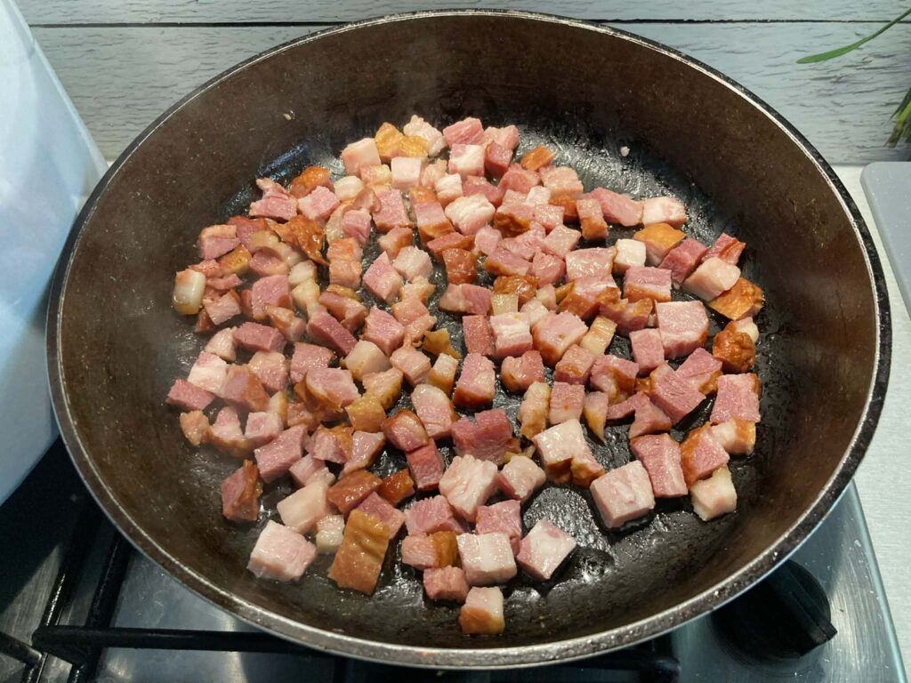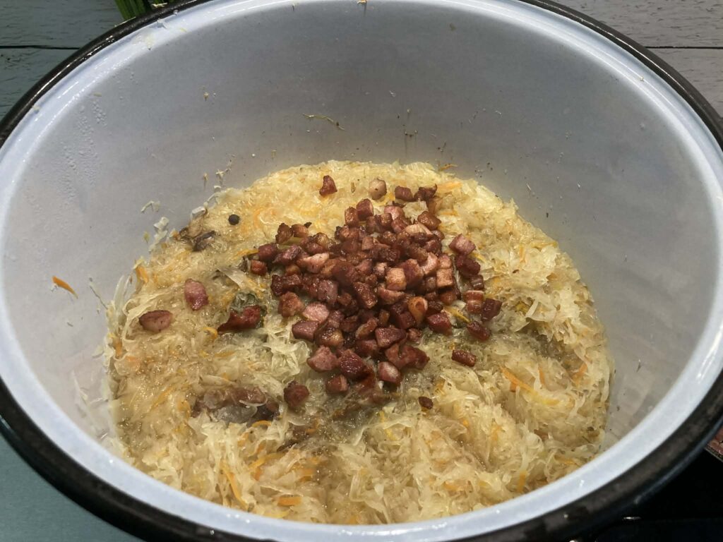 Mięso wieprzowe pokrój w kostkę, na patelni podsmaż je na rumiano i dodaj do garnka z kapustą.