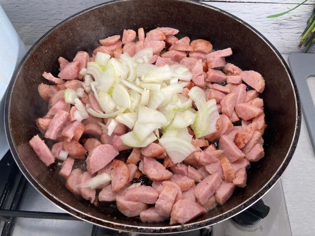 Cienką kiełbasę pokrój w talarki lub w pół talarki i chwilę podsmaż. Dodaj pokrojoną cebulę.