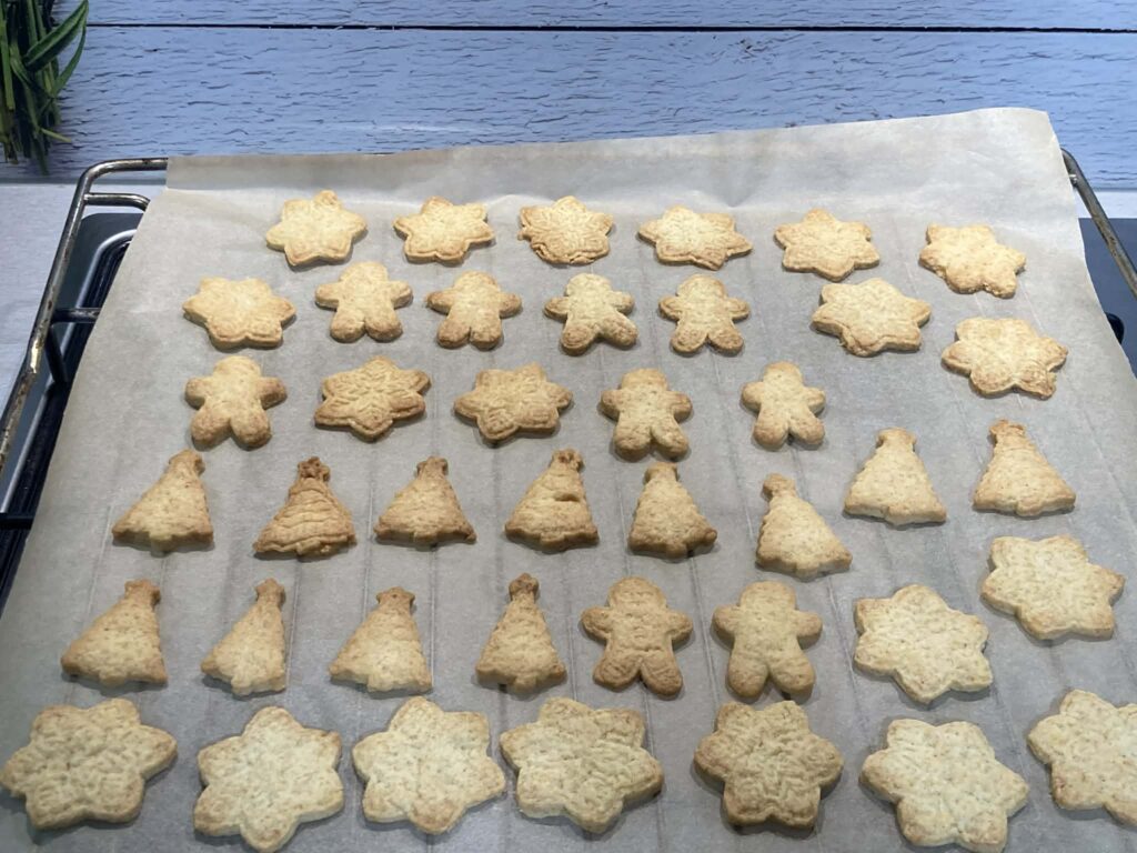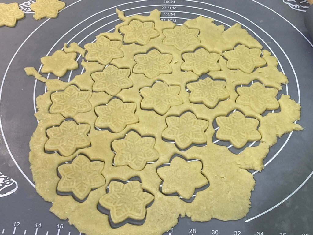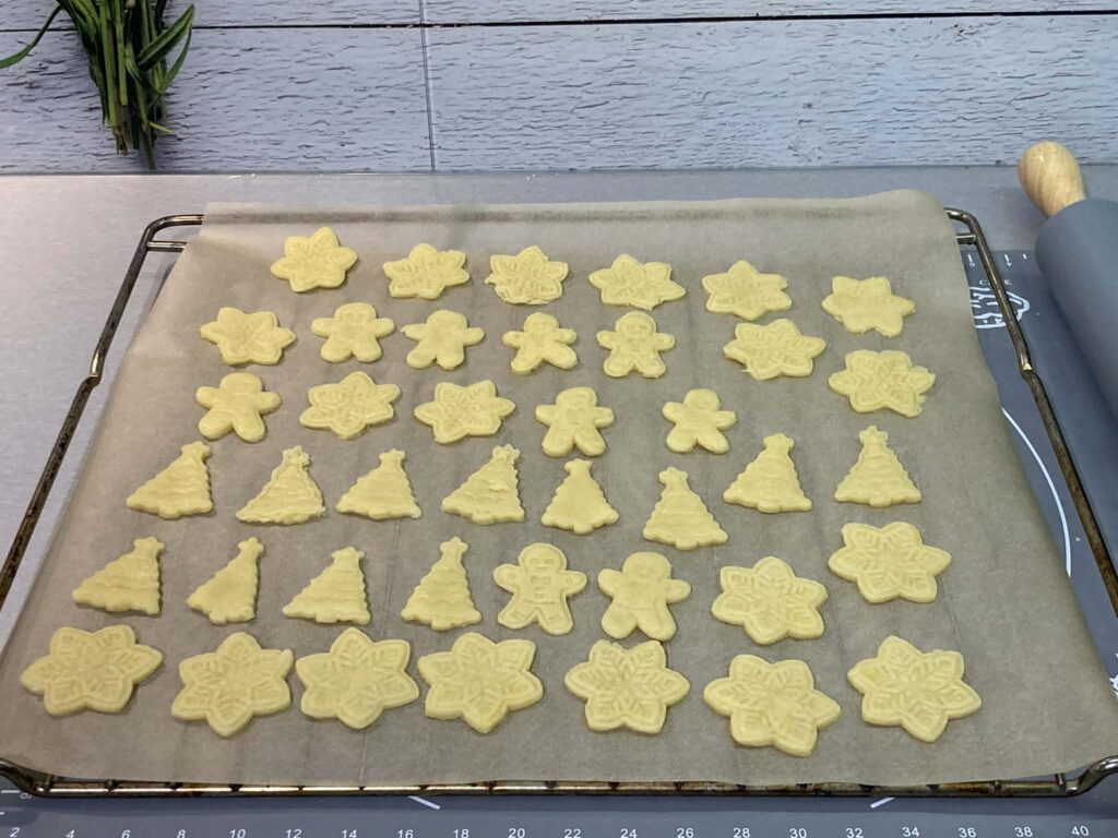 Schłodzone ciasto rozwałkuj na grubość ok. 5–7 mm. Wykrawaj ulubione kształty foremkami.