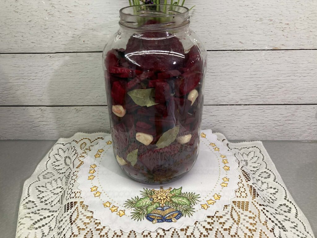 W garnku zagotuj wodę z solą zostaw do ostygnięcia. Zalej buraki solanką, tak aby były całkowicie przykryte.(Jeśli coś wypływa — dociśnij małym talerzykiem, ciężarkiem lub połówką buraka.