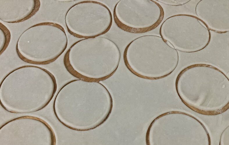 Odcinaj po kawałku, wałkuj cienko i wycinaj kółka. Resztę ciasta trzymaj przykrytą, aby nie wysychało.