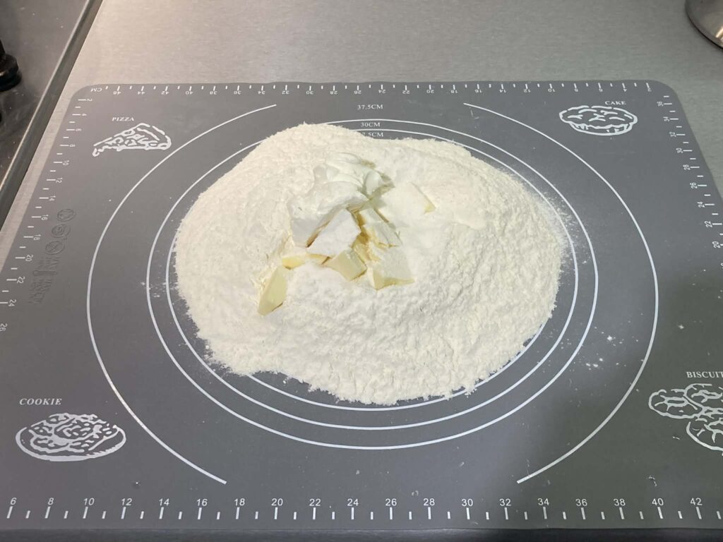 Mąkę przesiej razem z proszkiem do pieczenia i solą. Dodaj zimne masło pokrojone w kostkę i posiekaj nożem lub rozetrzyj palcami do uzyskania kruszonki.