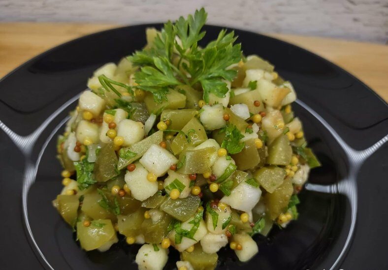 Ta surówka to doskonały dodatek do ryb smażonych, pieczonych i gotowanych. Połączenie chrupiących ogórków kiszonych, soczystych jabłek i delikatnie ostrej cebuli przełamane jest aromatycznym sosem z oliwy i musztardy francuskiej. Świeża natka pietruszki dodaje lekkości i świeżości, a całość świetnie równoważy smak ryby.
