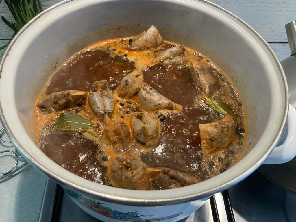 W dużym garnku zagotuj około 2,5 litra wody. Dodaj wszystkie przyprawy: ziele angielskie, liście laurowe, jałowiec, kolendrę, sól, pieprz i czosnek. Gotuj 5 minut, aby przyprawy uwolniły aromat. Następnie dodaj 6 torebek herbaty, zaparz przez kilka minut, po czym wyjmij je z garnka.