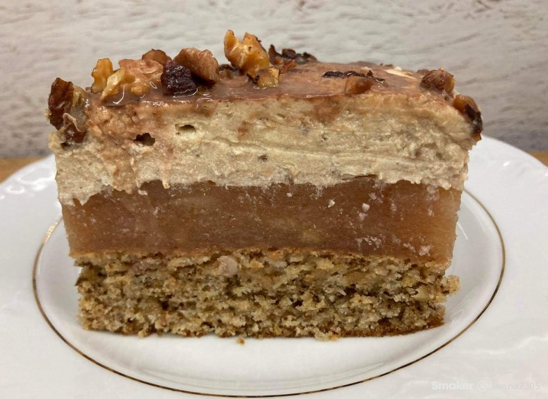 Ten jabłecznik to połączenie puszystego ciasta orzechowego, soczystej masy jabłkowej z galaretką, kremowej masy orzechowej oraz czekoladowej polewy z chrupiącymi orzechami. Ciasto jest sycące, pięknie się kroi i długo zachowuje świeżość. Idealne na weekend, święta albo rodzinne spotkanie.