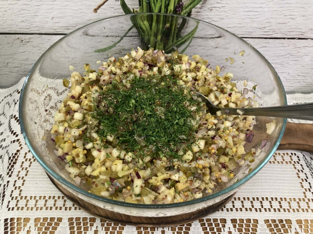 Na koniec dodaj drobno posiekany koperek i jeszcze raz delikatnie wymieszaj.
