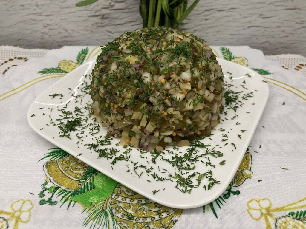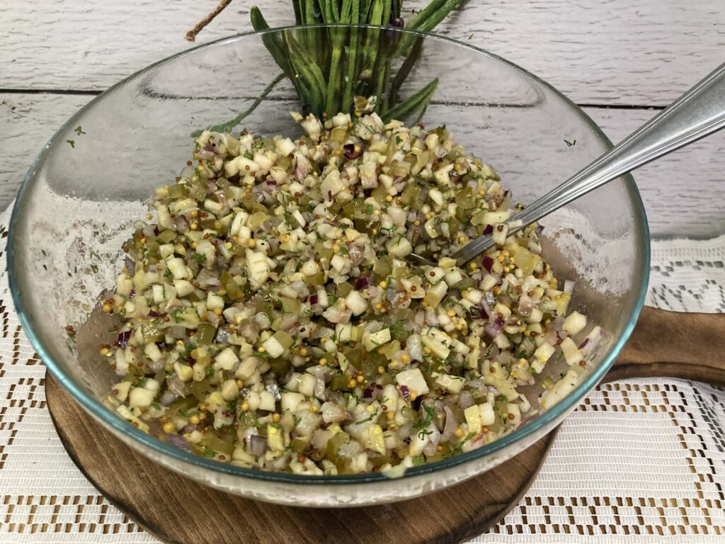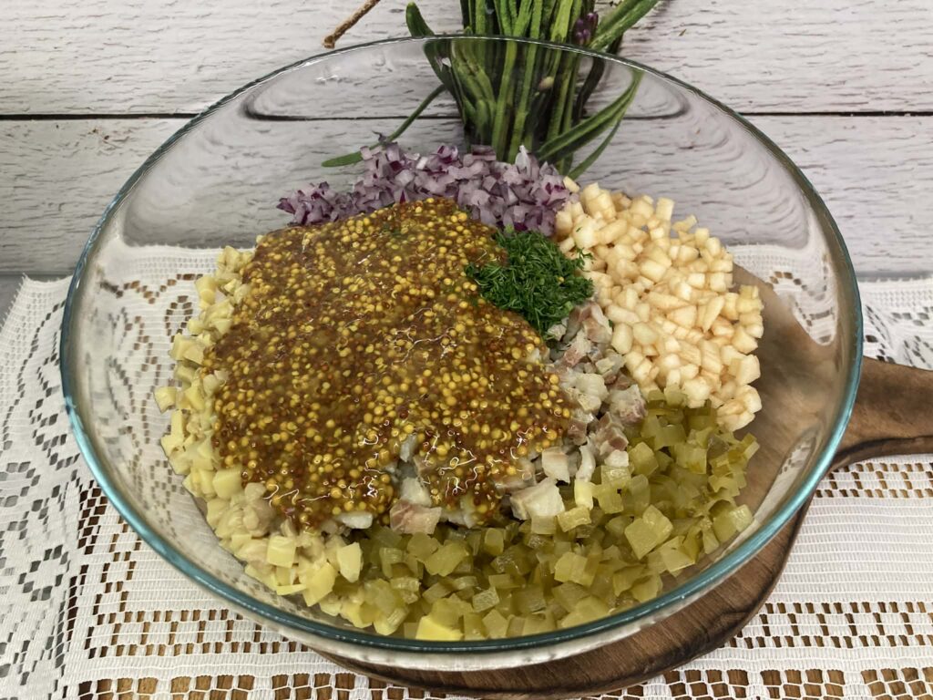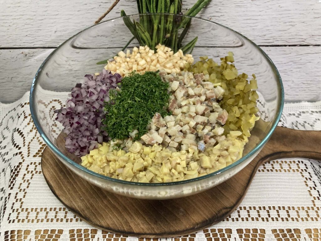 Pieczarki, ogórki kiszone oraz jabłko również pokrój w drobną kostkę. Jabłko możesz wcześniej obrać lub zostawić ze skórką – według uznania.