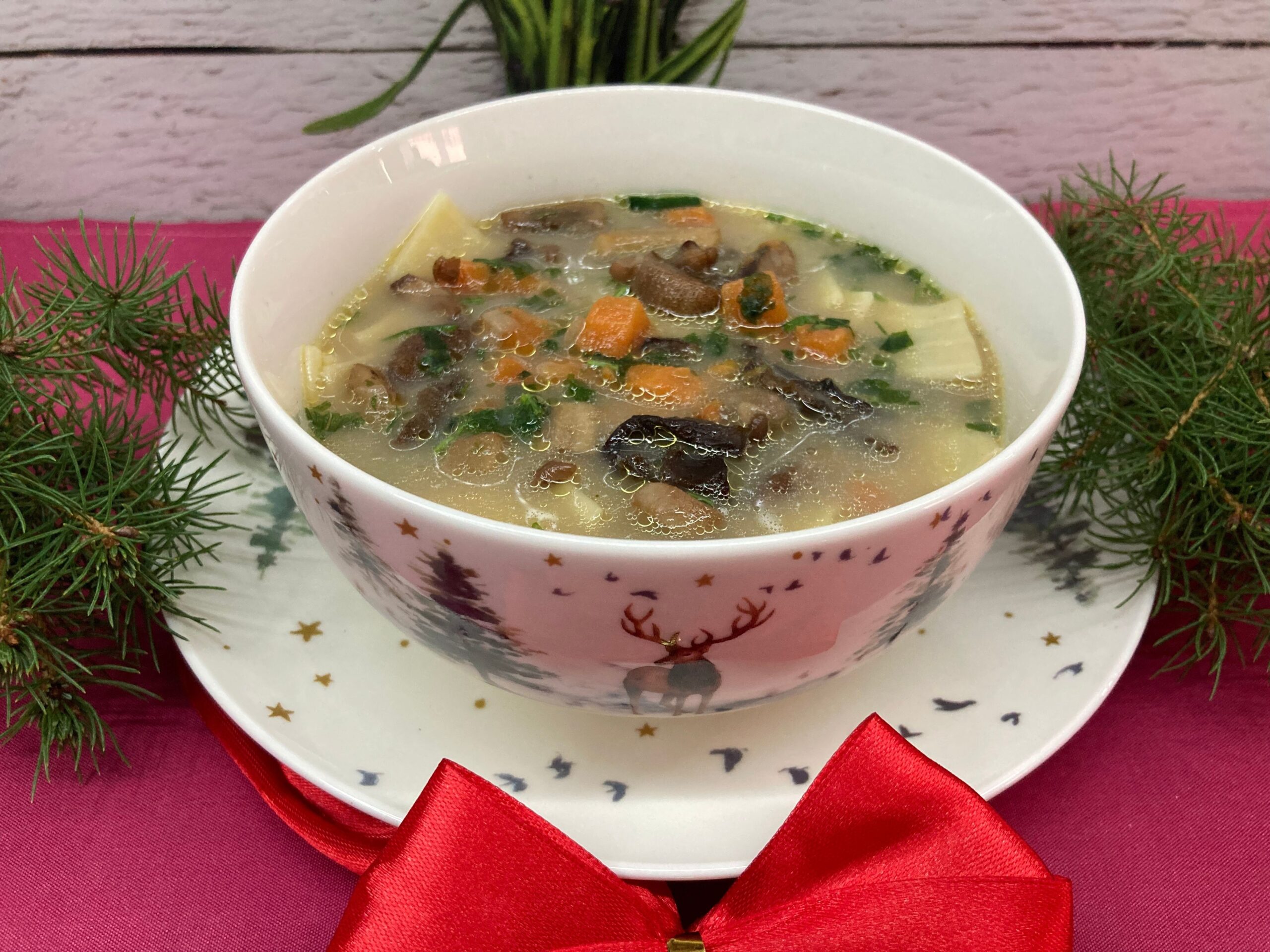 Aromatyczna, klarowna i pełna głębokiego smaku suszonych grzybów. Wigilijna zupa grzybowa to jedna z tych potraw, które od razu przywołują świąteczny klimat. Pachnie lasem, przyprawami i tradycją. Podana z makaronem łazanki jest sycąca, a jednocześnie delikatna – idealna na kolację wigilijną.