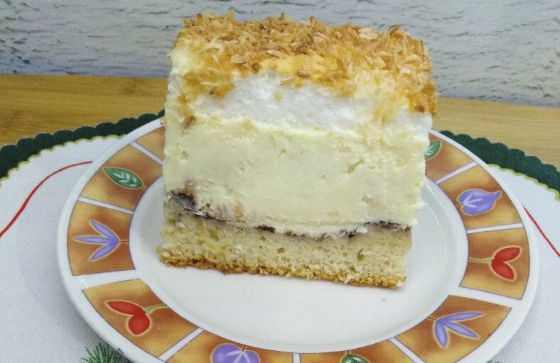 Ten sernik to klasyczne, domowe ciasto, które zawsze się udaje. Ma kakaowy spód, puszystą i kremową masę serową, a na wierzchu delikatną bezę z wiórkami kokosowymi, która po upieczeniu tworzy charakterystyczną „rosę”. Ciasto jest wilgotne, aromatyczne i idealne na święta oraz rodzinne spotkania.