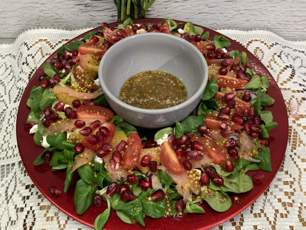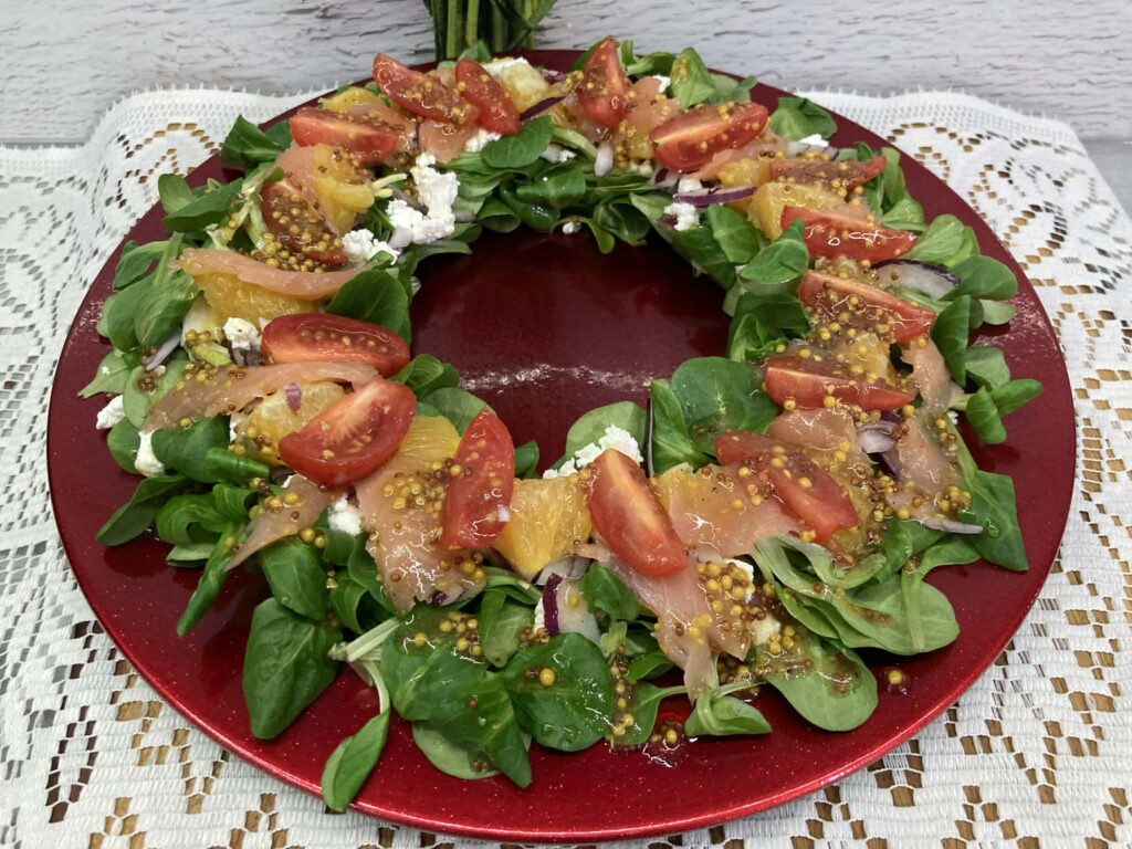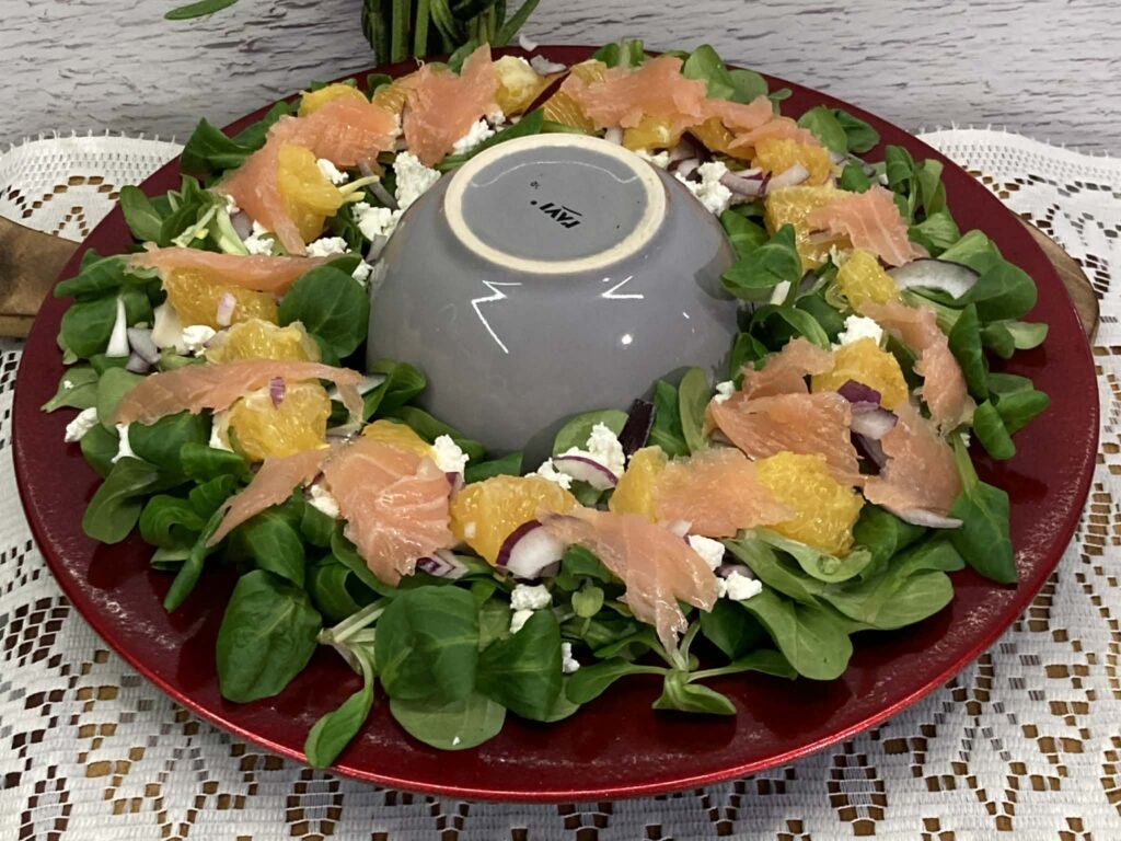 Wieniec sałatkowy to elegancka i świeża propozycja na stół świąteczny, przyjęcie lub lekki lunch. Połączenie delikatnej roszponki, wędzonego łososia, słonej fety oraz soczystej pomarańczy tworzy harmonijny balans smaków. Granat i pomidorki dodają koloru, a prosty cytrusowo-musztardowy sos pięknie wszystko spaja. Sałatka nie tylko świetnie smakuje, ale też efektownie wygląda.