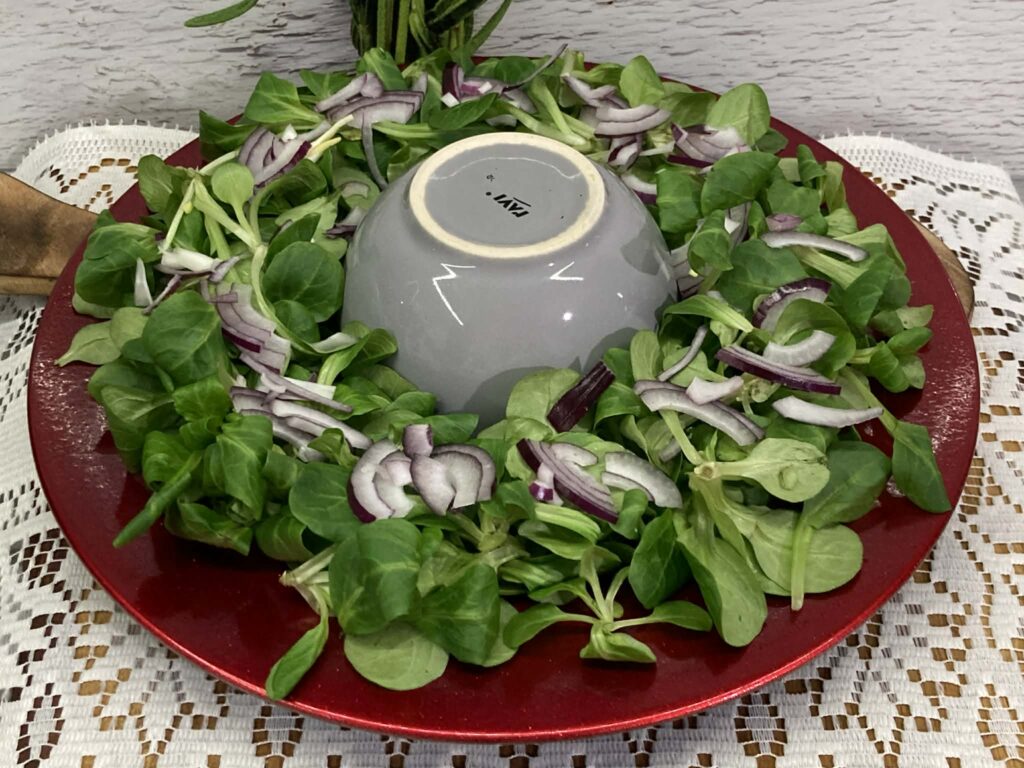 Roszponkę dokładnie umyj i osusz. Ułóż ją na dużym, płaskim talerzu w kształcie wieńca, zostawiając puste miejsce pośrodku. Cebulę czerwoną pokrój w cienkie piórka.