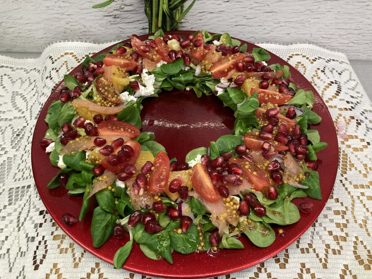 Wieniec sałatkowy to elegancka i świeża propozycja na stół świąteczny, przyjęcie lub lekki lunch. Połączenie delikatnej roszponki, wędzonego łososia, słonej fety oraz soczystej pomarańczy tworzy harmonijny balans smaków. Granat i pomidorki dodają koloru, a prosty cytrusowo-musztardowy sos pięknie wszystko spaja. Sałatka nie tylko świetnie smakuje, ale też efektownie wygląda.