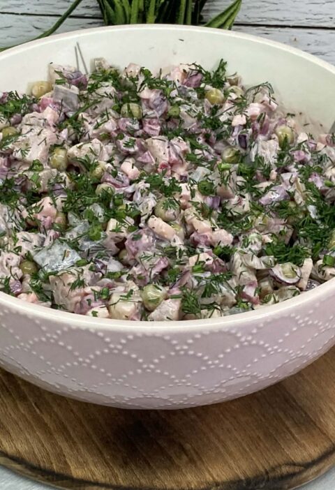 Prosta i wyrazista sałatka śledziowa, która łączy słoność śledzi z kwaskowatością ogórków kiszonych i jabłka. Dodatek dwóch rodzajów musztardy, czosnku i koperku nadaje jej charakteru i świeżości. Idealna na kolację, święta lub jako szybka przekąska.