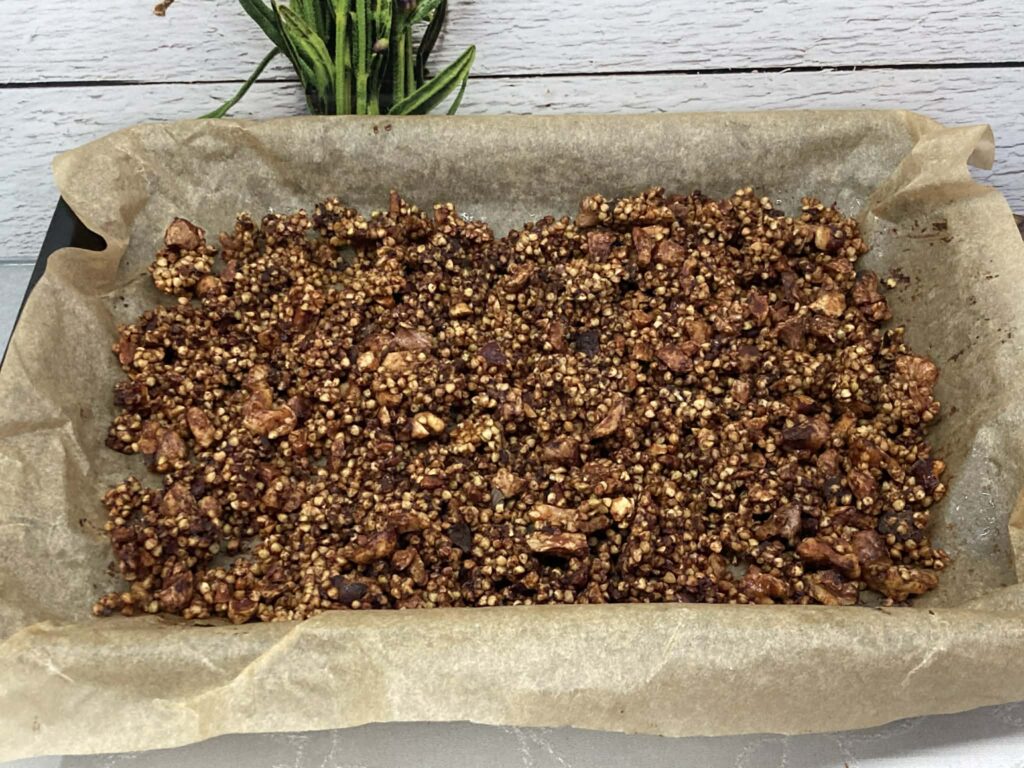 Piecz w piekarniku nagrzanym do 180°C przez około 20 minut, mieszając raz w połowie pieczenia, aż kasza i orzechy będą złociste i chrupiące.