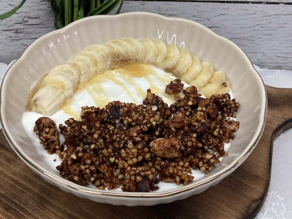 Do miseczki nałóż jogurt grecki, dodaj plasterki banana, posyp chrupiącą kaszą gryczaną i polej odrobiną miodu. Idealne śniadanie lub deser bez wyrzutów sumienia 🍯🍌