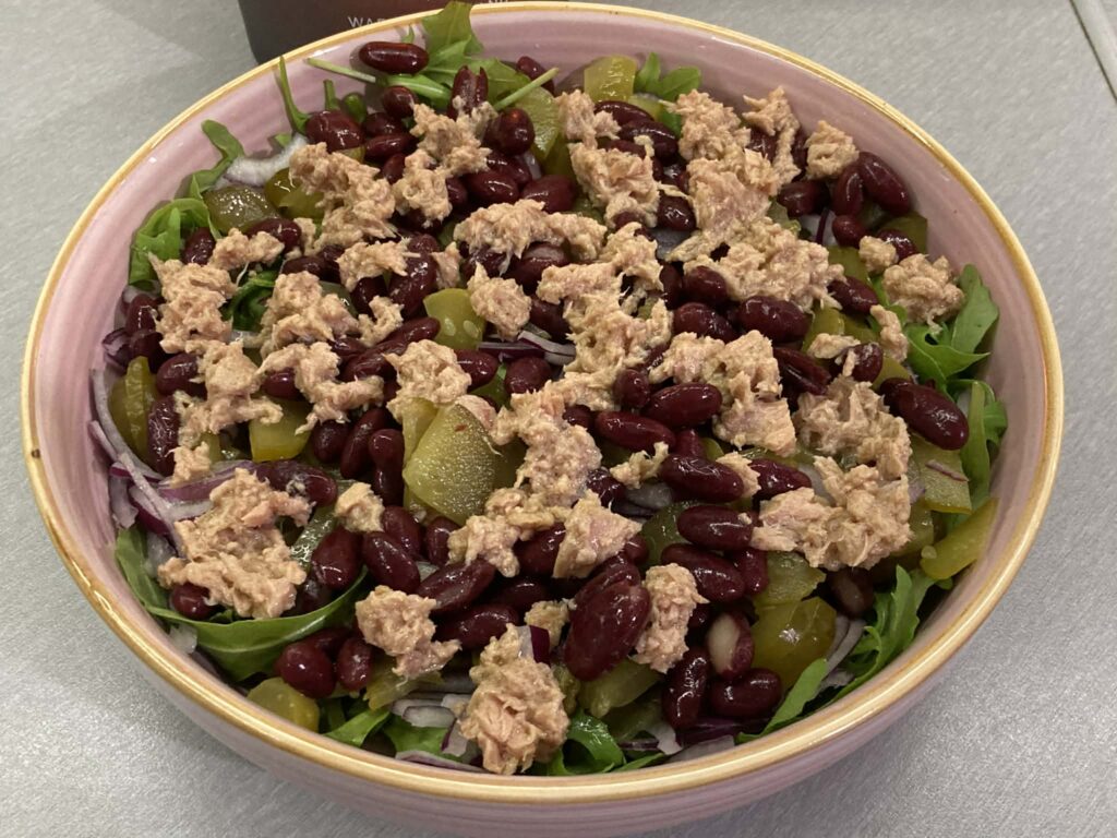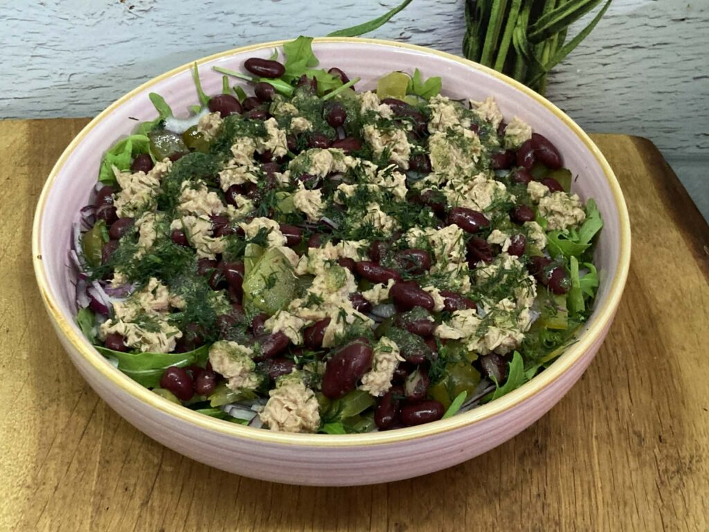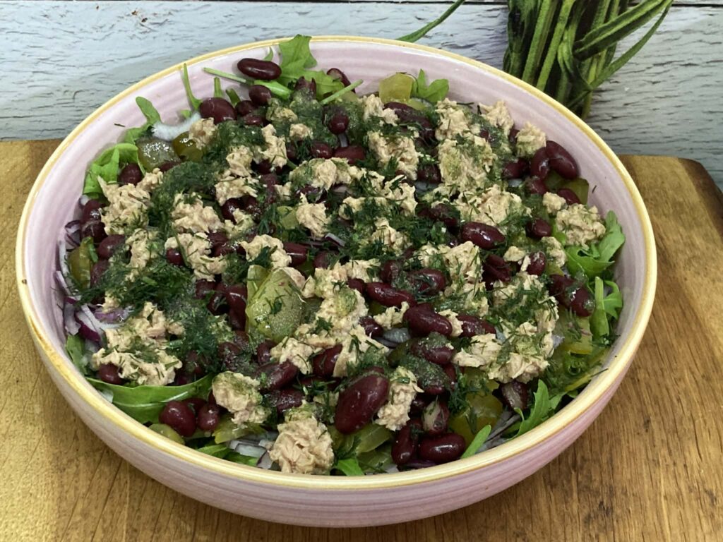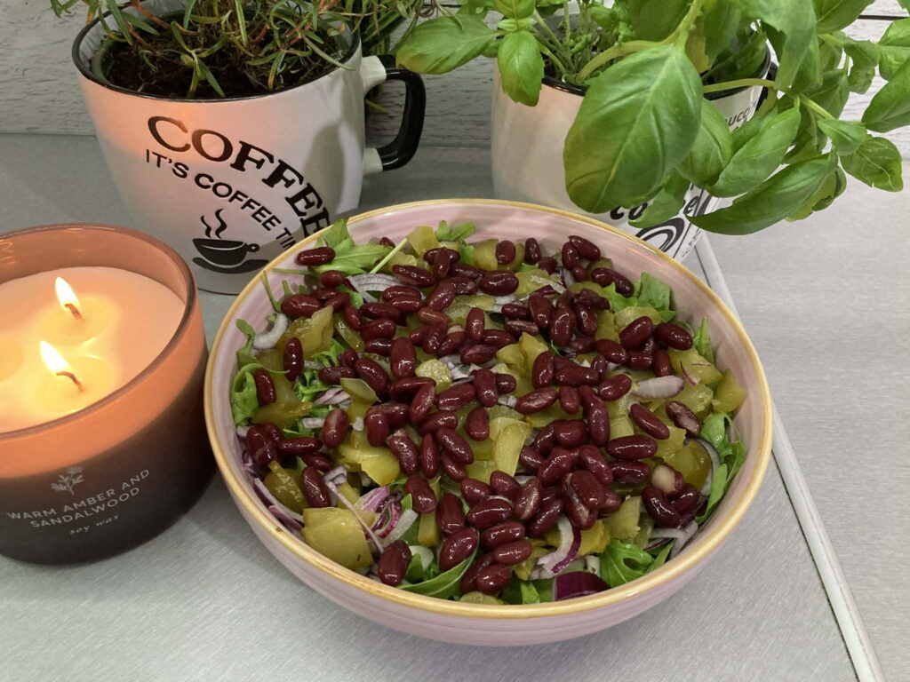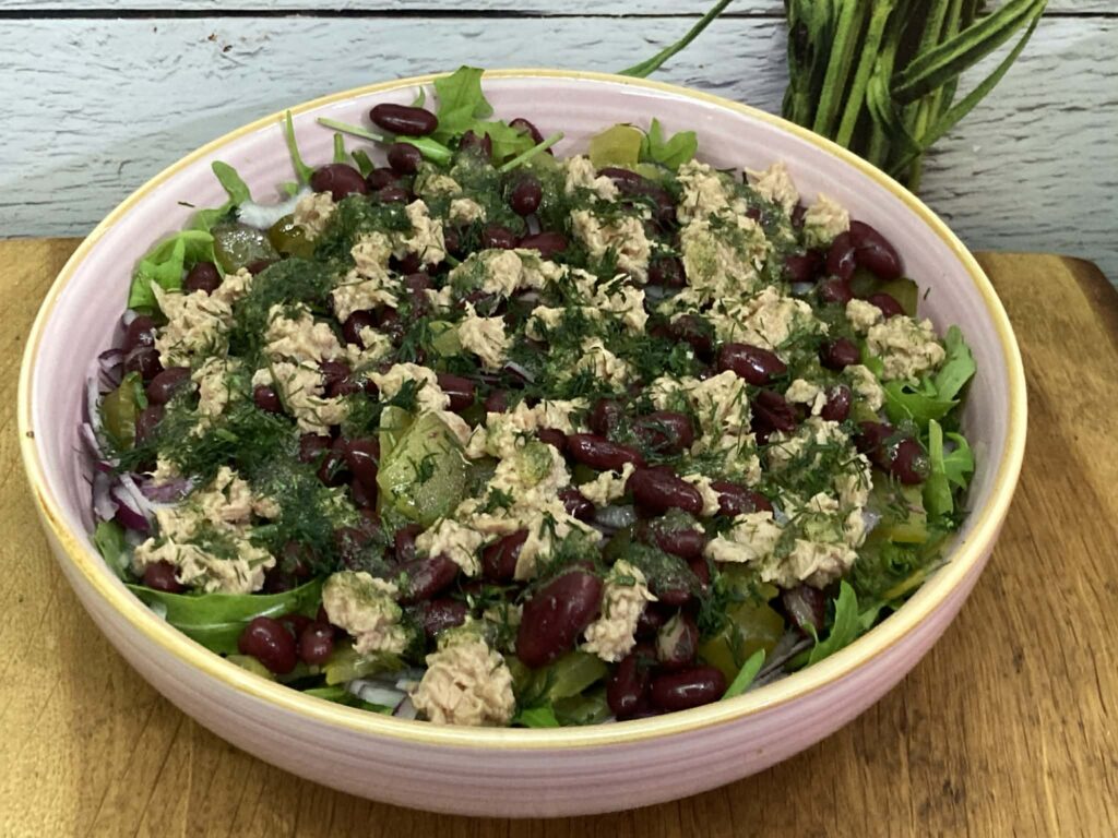To jedna z tych sałatek, które robi się w 10 minut, a smakują jak coś dużo bardziej pracochłonnego. Idealna na lekką kolację, szybki lunch albo jako dodatek do obiadu. Jest świeża, lekko kwaskowa dzięki ogórkom kiszonym i bardzo sycąca za sprawą tuńczyka oraz czerwonej fasoli.