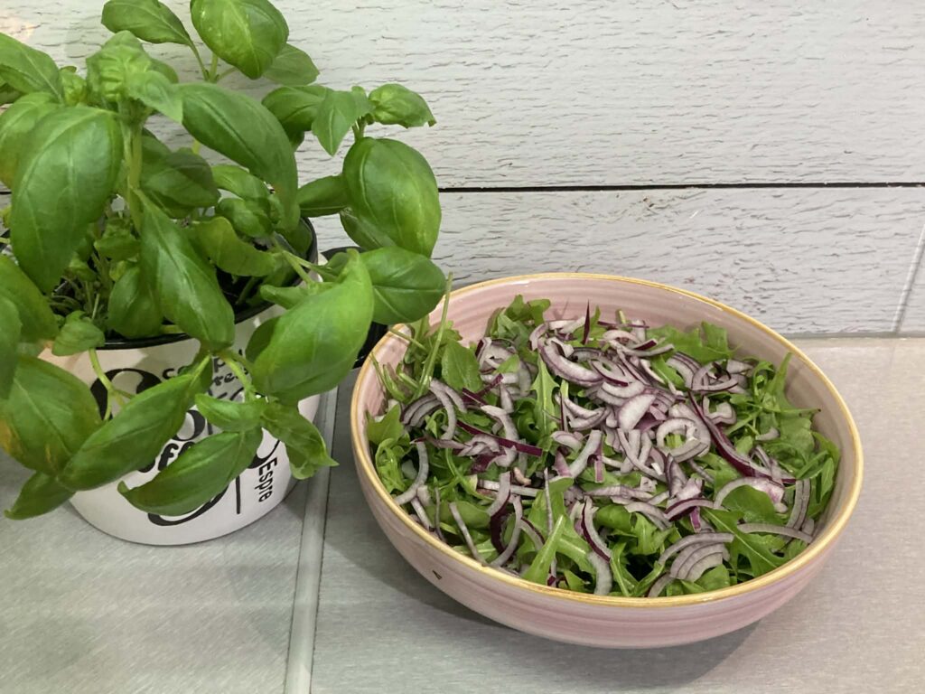 Czerwoną cebulę obierz i pokrój w cienkie piórka. Posyp nią rukolę.