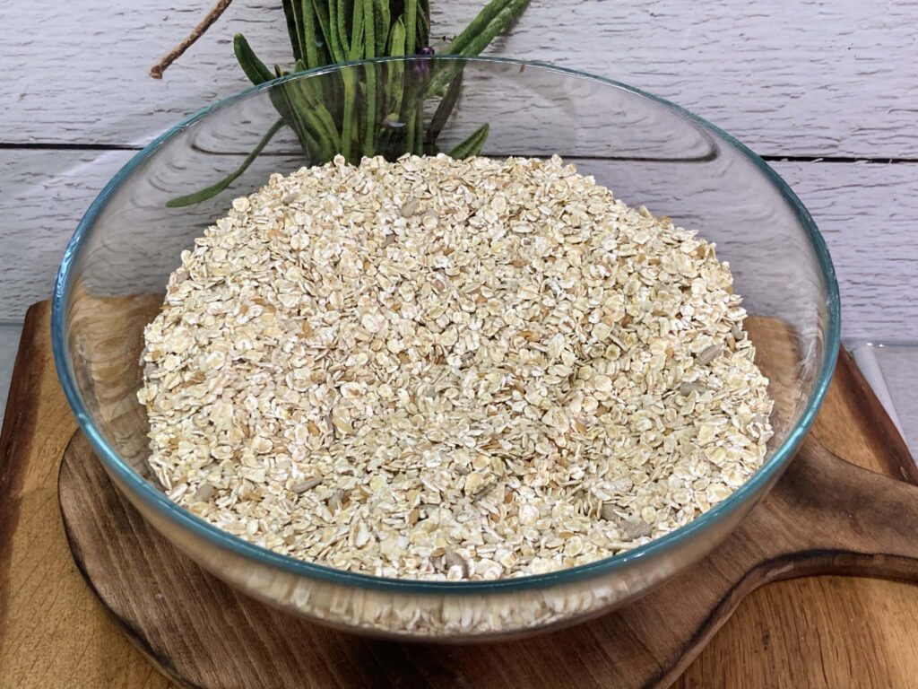 Do dużej miski wsyp płatki owsiane oraz wszystkie nasiona.