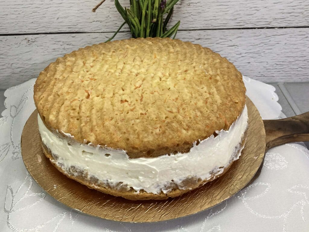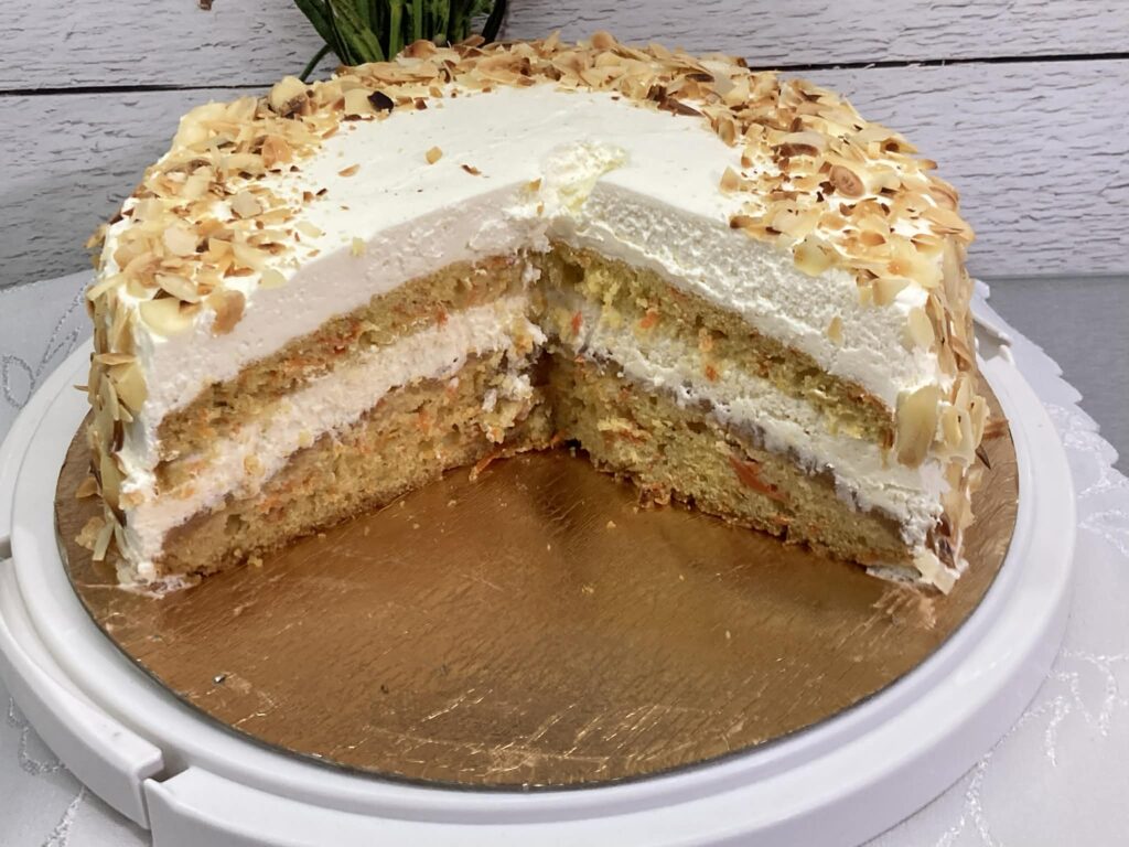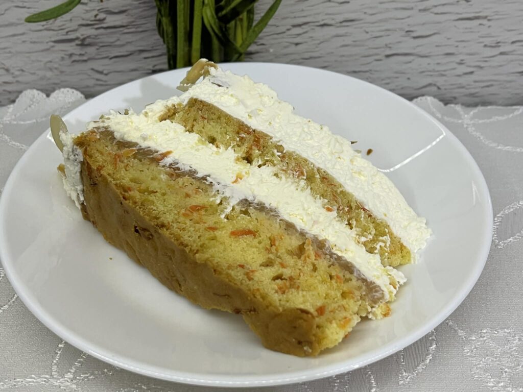 Ten tort marchewkowy to idealne połączenie wilgotnego, aromatycznego ciasta z delikatną masą śmietanową i słodko-kwaśnym dżemem brzoskwiniowym. Całość dopełniają chrupiące, lekko prażone płatki migdałowe. To tort, który pięknie wygląda, świetnie się kroi i smakuje jeszcze lepiej po nocy spędzonej w lodówce. Doskonały na rodzinne uroczystości, święta albo po prostu do popołudniowej kawy.
