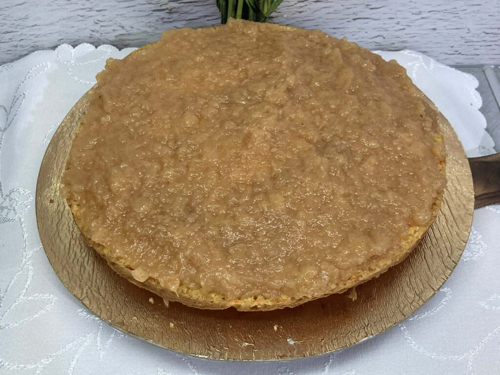 Dolny blat posmaruj połową dżemu brzoskwiniowego.