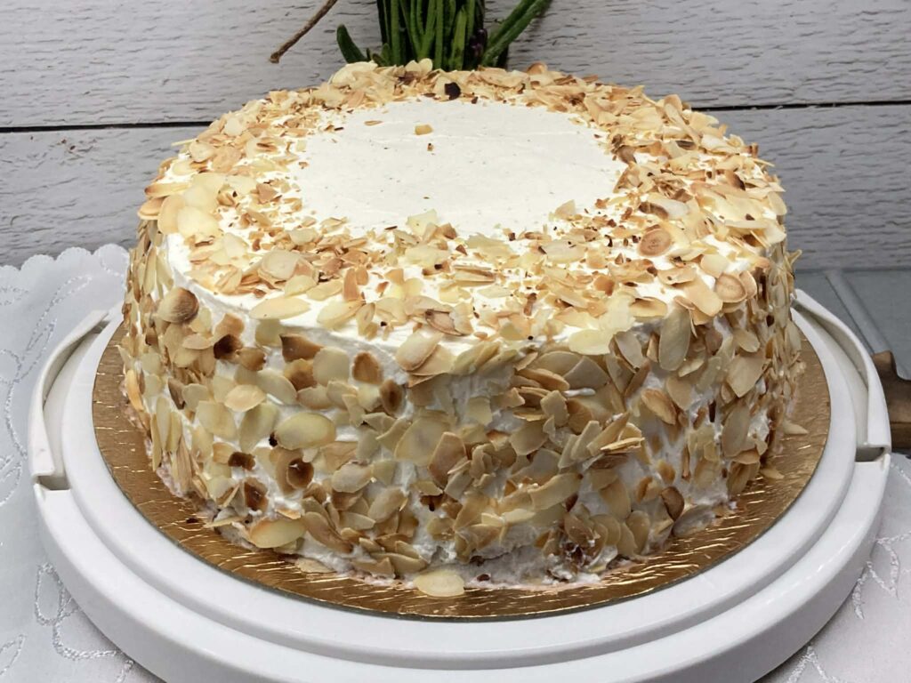 Płatki migdałowe upraż na suchej patelni na złoty kolor i po wystudzeniu udekoruj nimi wierzch oraz boki tortu.