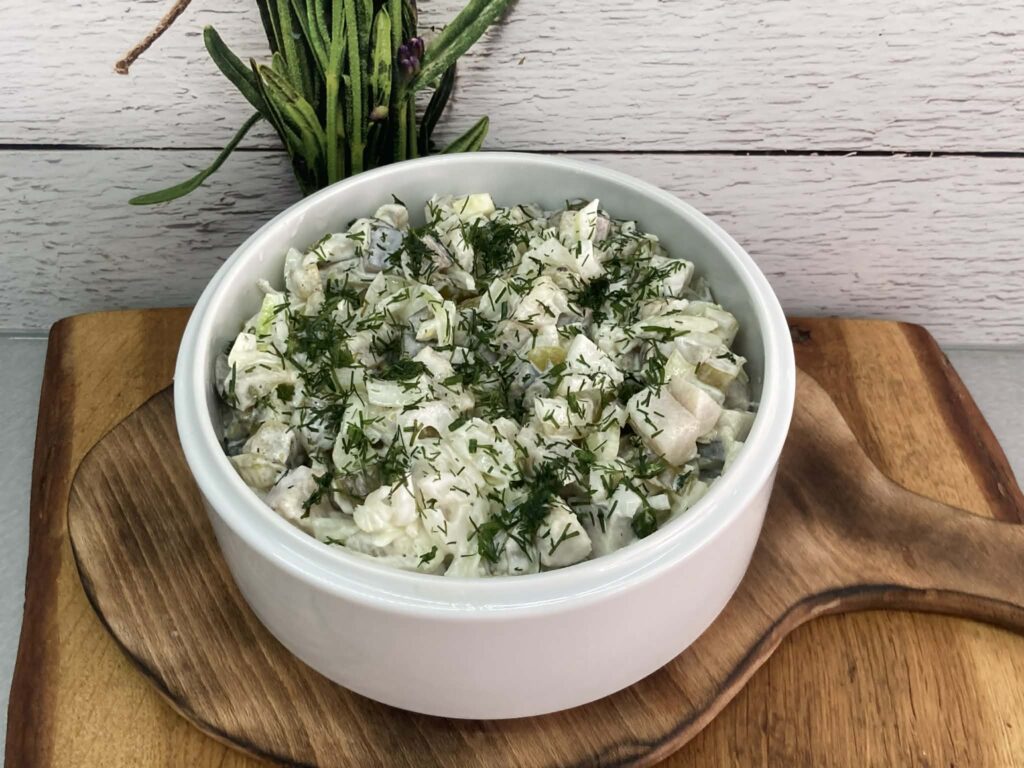 Wierzch sałatki posyp drobno posiekanym koperkiem.