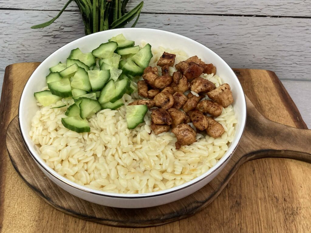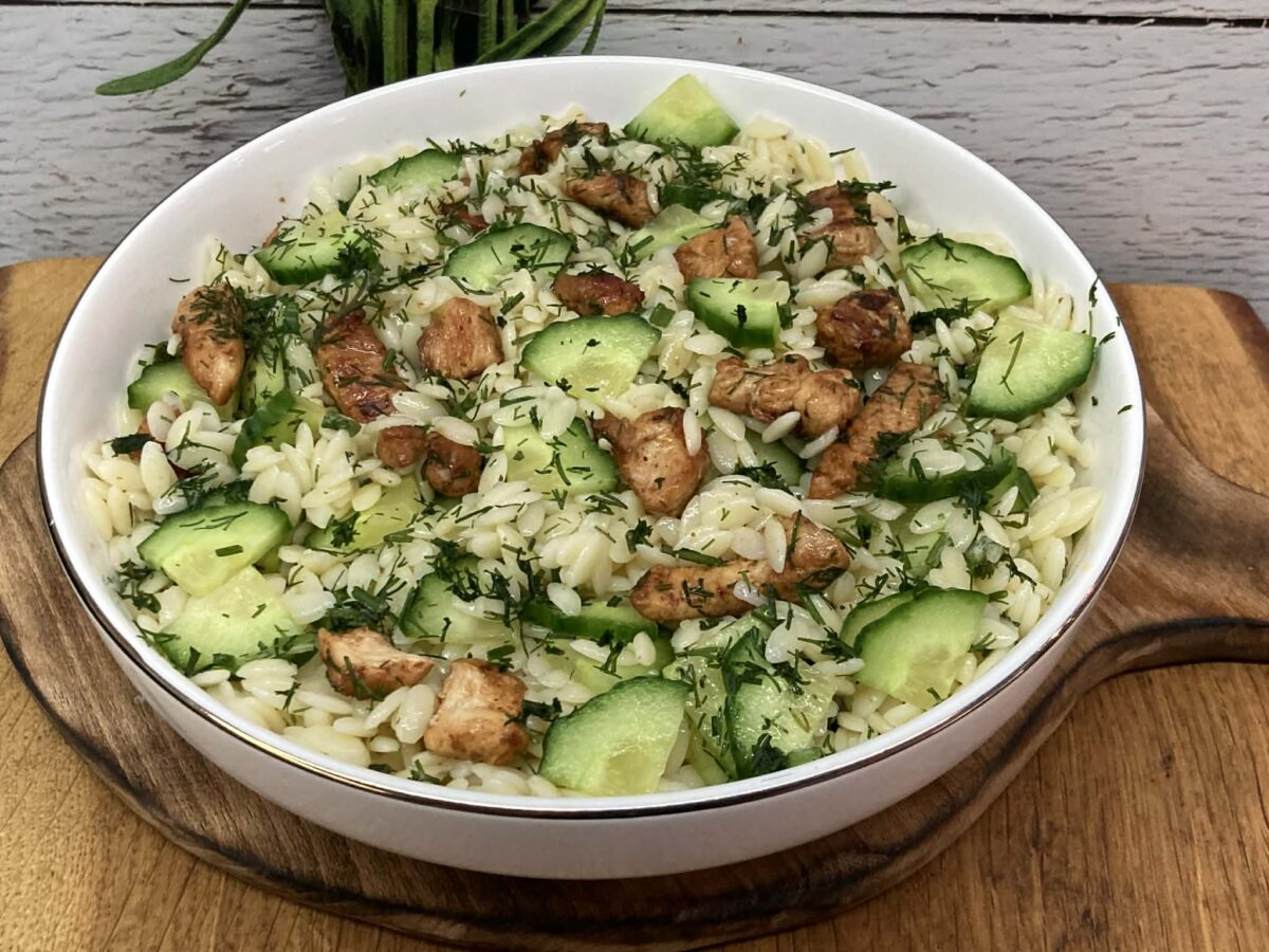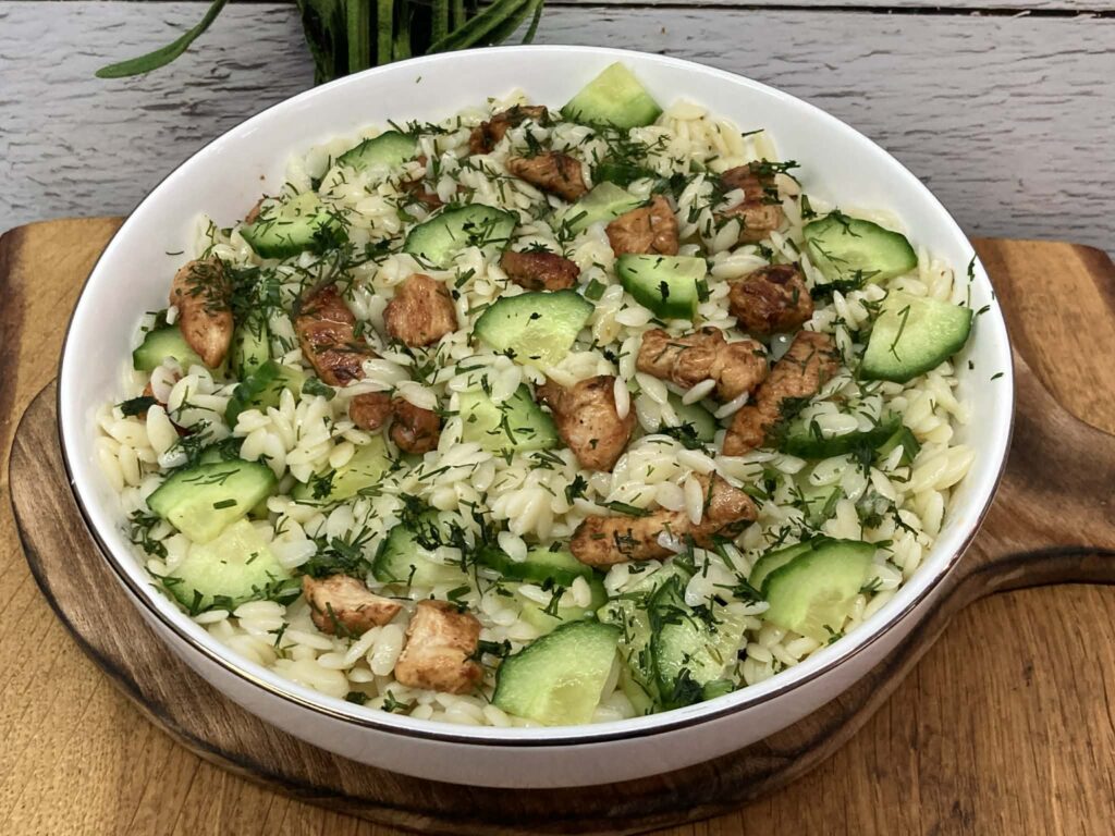 Ta sałatka makaronowa to idealny pomysł na szybki obiad, kolację albo lunch do pracy. Jest lekka, sycąca i bardzo prosta w przygotowaniu. Delikatny makaron orzo, soczysty kurczak i świeży ogórek tworzą razem smaczną i uniwersalną kompozycję.