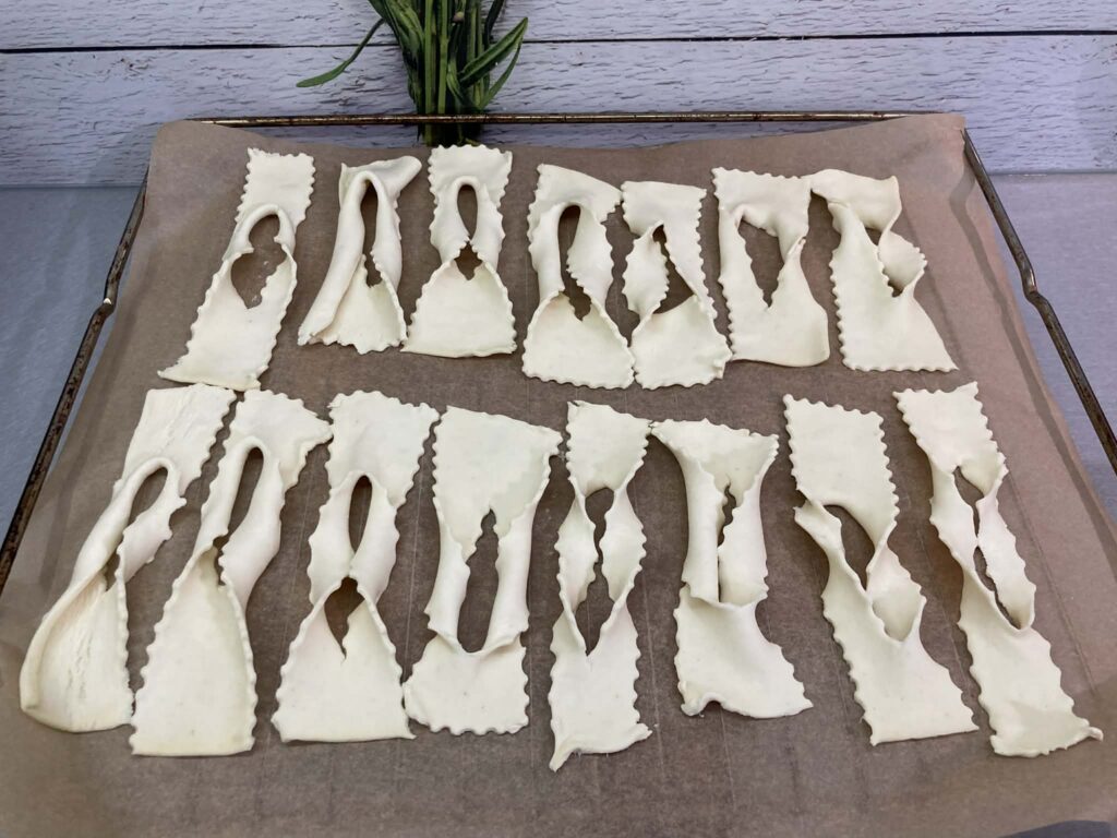 Ułóż faworki na blasze wyłożonej papierem do pieczenia.
