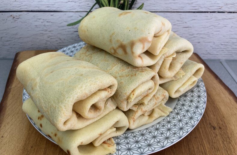 Gotowe naleśniki świetnie smakują z sosem czosnkowym lub kleksem śmietany.