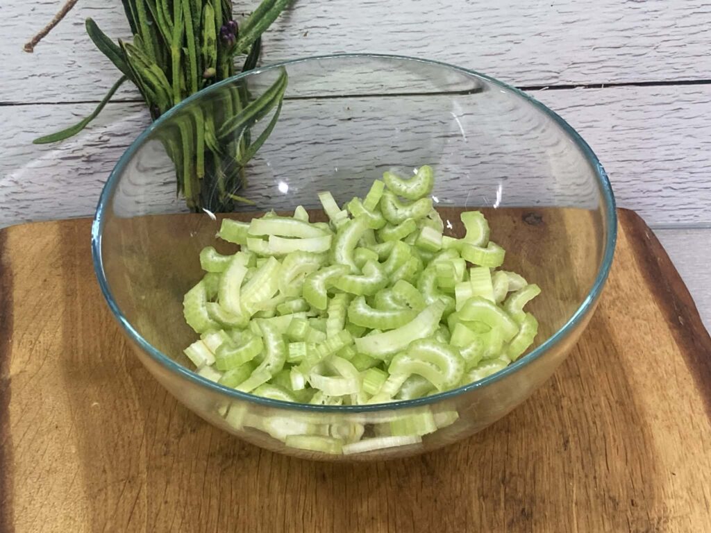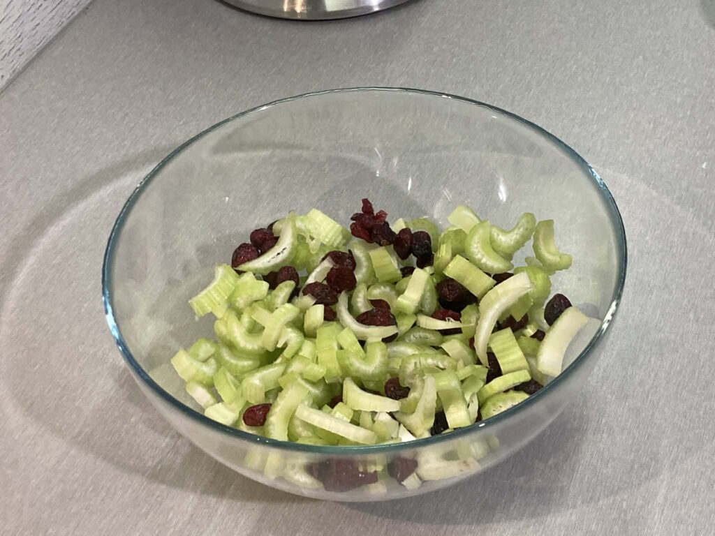 Dodaj seler, żurawinę oraz ostudzonego kurczaka. Całość dokładnie wymieszaj i wstaw do lodówki na 15–20 minut, aby smaki się połączyły.