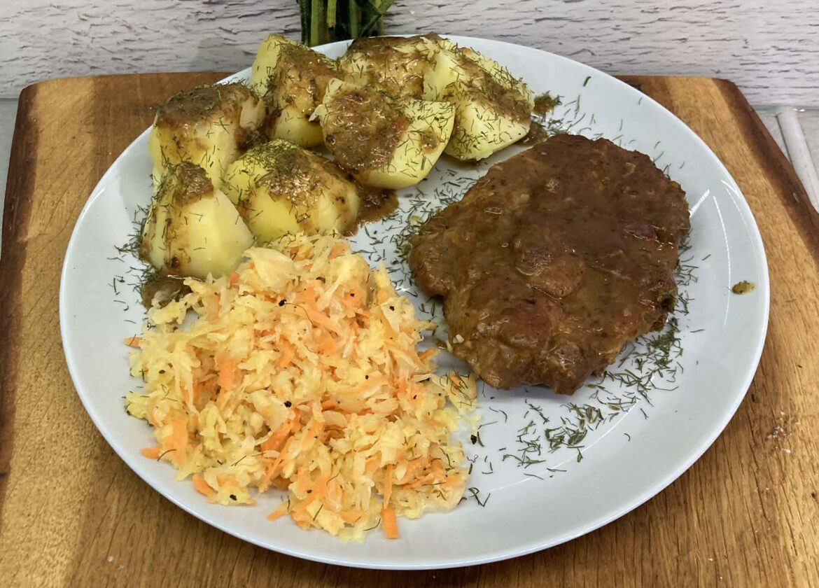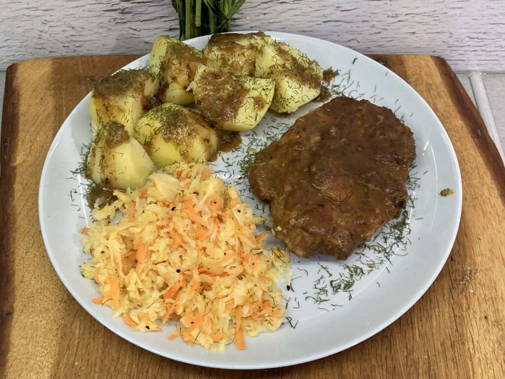 Soczysty, miękki karczek duszony w aromatycznym sosie na bazie cebuli, przypraw i śmietanki. Dzięki długiemu marynowaniu mięso jest pełne smaku, a klasyczne dodatki – ziemniaki i surówka z kiszonej kapusty – idealnie dopełniają to domowe, rozgrzewające danie. Idealne na obiad, kiedy masz ochotę na coś konkretnego i tradycyjnego.