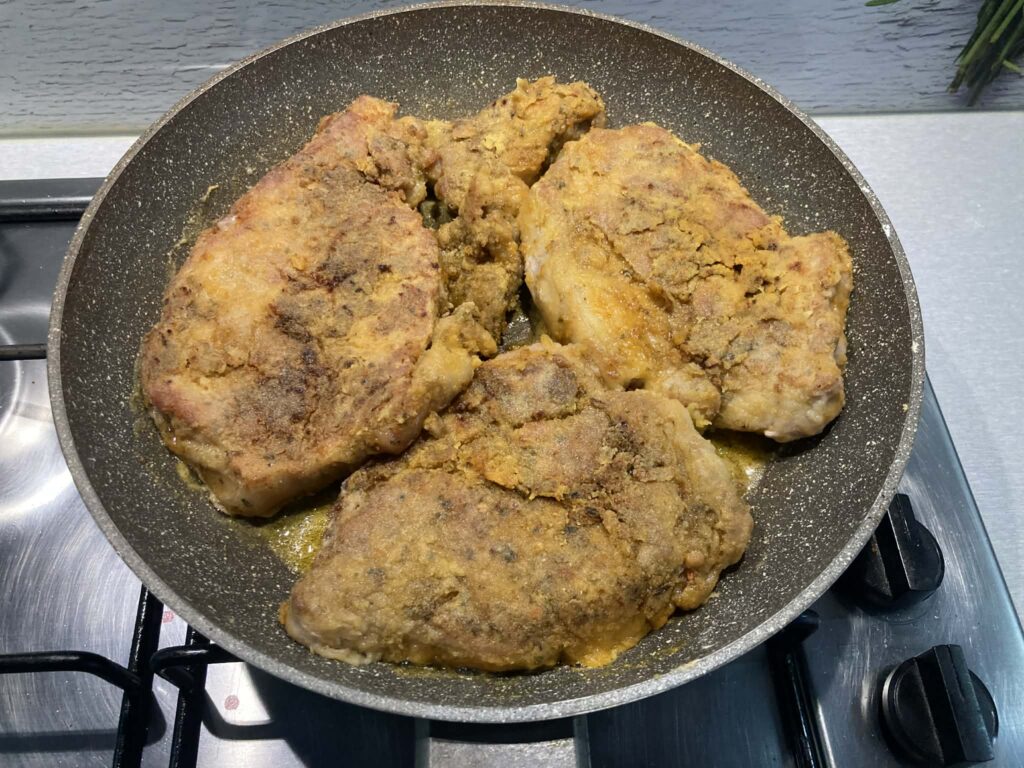 Na patelni rozgrzej masło klarowane. Zamarynowane plastry karczku obtocz w mące i obsmaż na złoty kolor z obu stron.