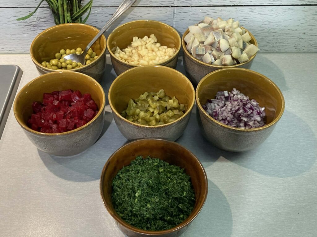 Śledzie jeśli są bardzo słone, namocz w zimnej wodzie lub mleku (ok. 30–60 min), następnie osusz i pokrój w kostkę. Czerwoną cebulę obierz i pokrój w kostkę (możesz sparzyć wrzątkiem, żeby była łagodniejsza).
