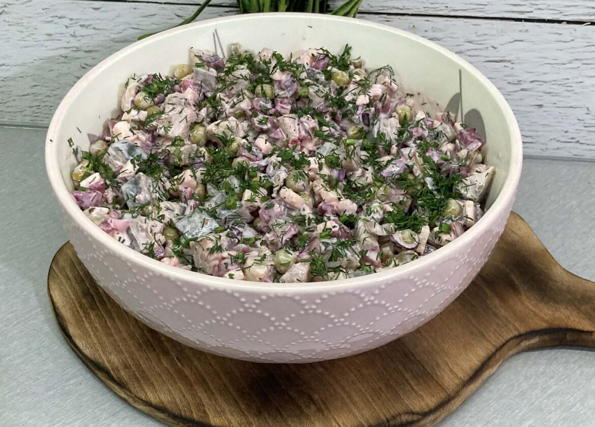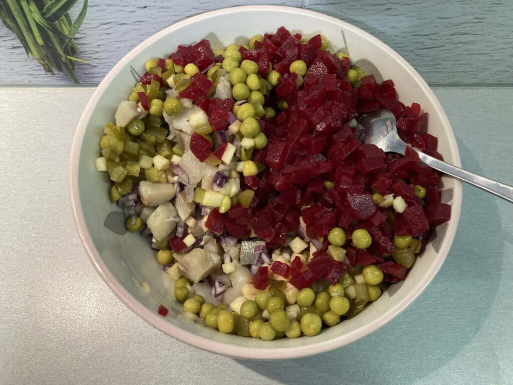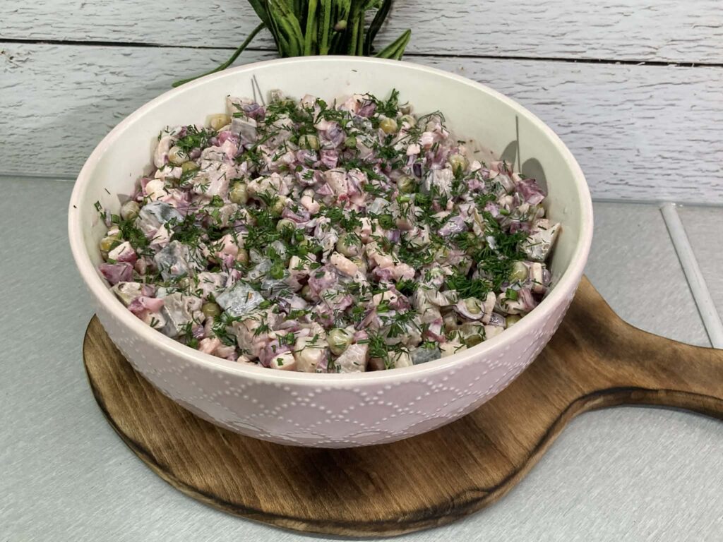 Sałatka śledziowa z buraczkami i jabłkiem to klasyczne połączenie smaków kuchni polskiej. Delikatnie słone śledzie świetnie komponują się ze słodyczą buraków i jabłka, a ogórki kiszone dodają całości wyrazistości. Kremowy sos na bazie majonezu i śmietany łagodzi smaki, a świeży koper nadaje sałatce aromatu i świeżości. To sycąca, a jednocześnie lekka propozycja idealna na święta, rodzinne spotkania lub kolację.
