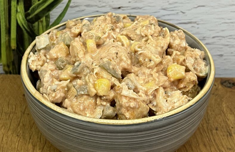 Ta sałatka z kurczakiem to bardzo sycąca i lubiana klasyka. Jest idealna na kolację, spotkania rodzinne albo imprezy, bo robi się ją z prostych składników i zawsze szybko znika ze stołu. Soczysty kurczak doprawiony przyprawą gyros świetnie łączy się z chrupiącą kapustą pekińską, kwaśnym ogórkiem kiszonym i słodką kukurydzą. Całość spina prosty sos na bazie majonezu i ketchupu, który nadaje sałatce wyrazisty, domowy smak.